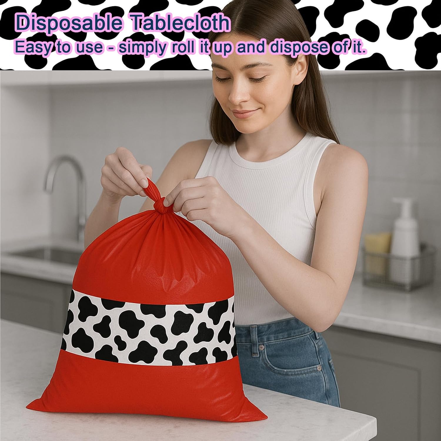 - Premium-Grade Material: Crafted from high-quality plastic, our cow-print tablecloths boast vibrant, fade-resistant colors and durable construction. Lightweight yet tear-resistant, they maintain their cheerful appearance through multiple uses, making them ideal for buffet tables, outdoor picnics, farmhouse dinners, and everyday kitchen use.
