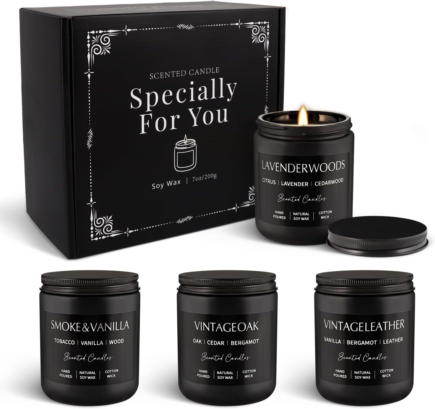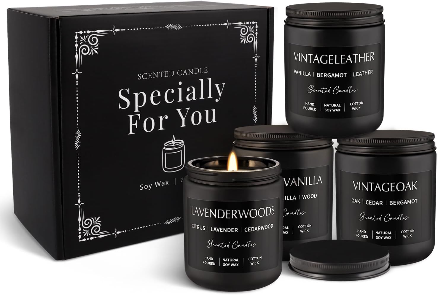 Scented Candles Gift Set - 4 Pack (7oz Each) Soy Wax Aromatherapy Candles with Essential Oils, Smokeless - Leather & Smoke, Vanilla Oakmoss, Lavender - Relaxing Fragrance for Home, Office, Yoga