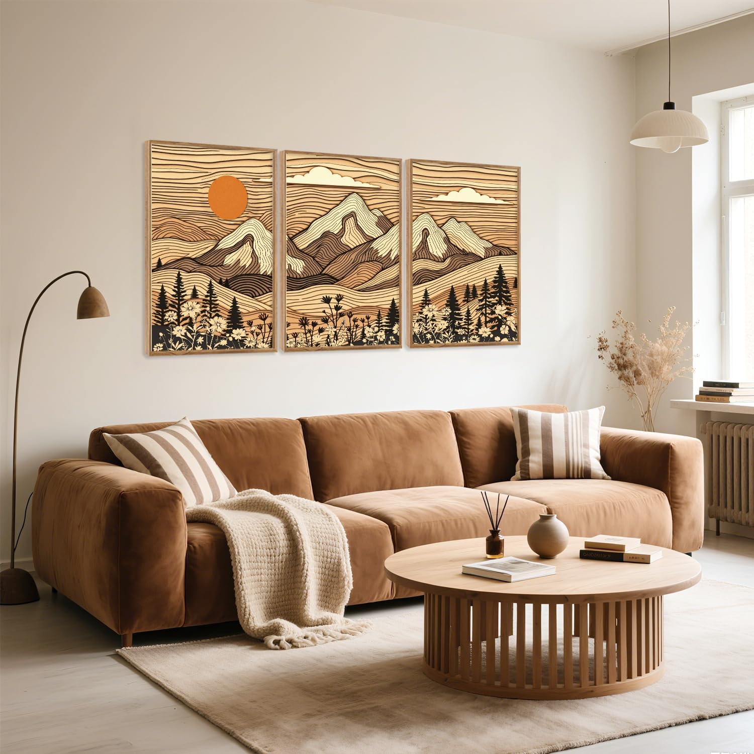 - 【Country Woodcut Style Wall Art】The decorative paintings feature a woodcut style design with line as the primary tones.They skillfully integrate elements of mountains, trees, and moon to create a fresh and retro aesthetic.
