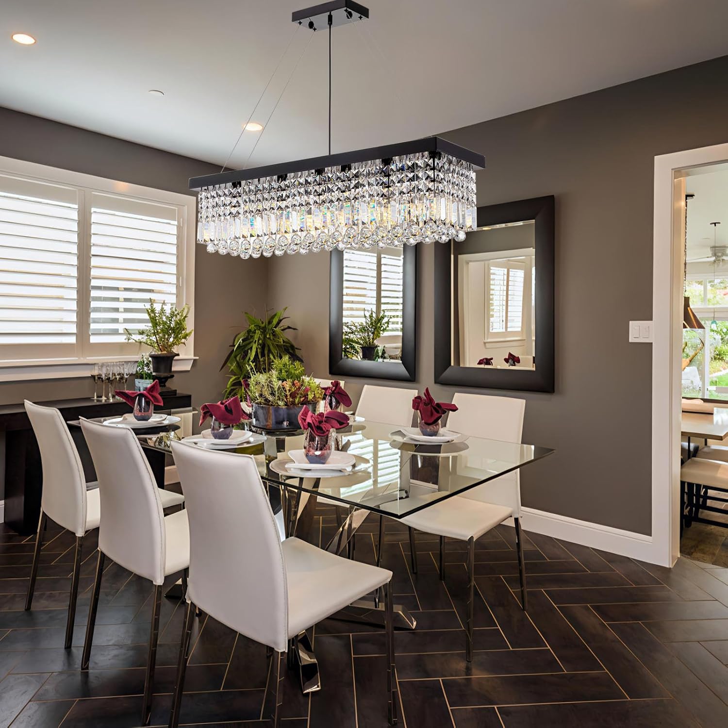 - BLACK CRYSTAL CHANDELIERS: Crafted with premium K9 crystals and a sleek black wrought iron frame, this black crystal chandelier creates an awe-inspiring display of light. The polished black wrought iron finish enhances the sparkle of each crystal, offering a luxurious ambiance that elevates your space and outshines other crystal chandeliers. Its modern black design makes it perfect for adding a contemporary touch to your home.