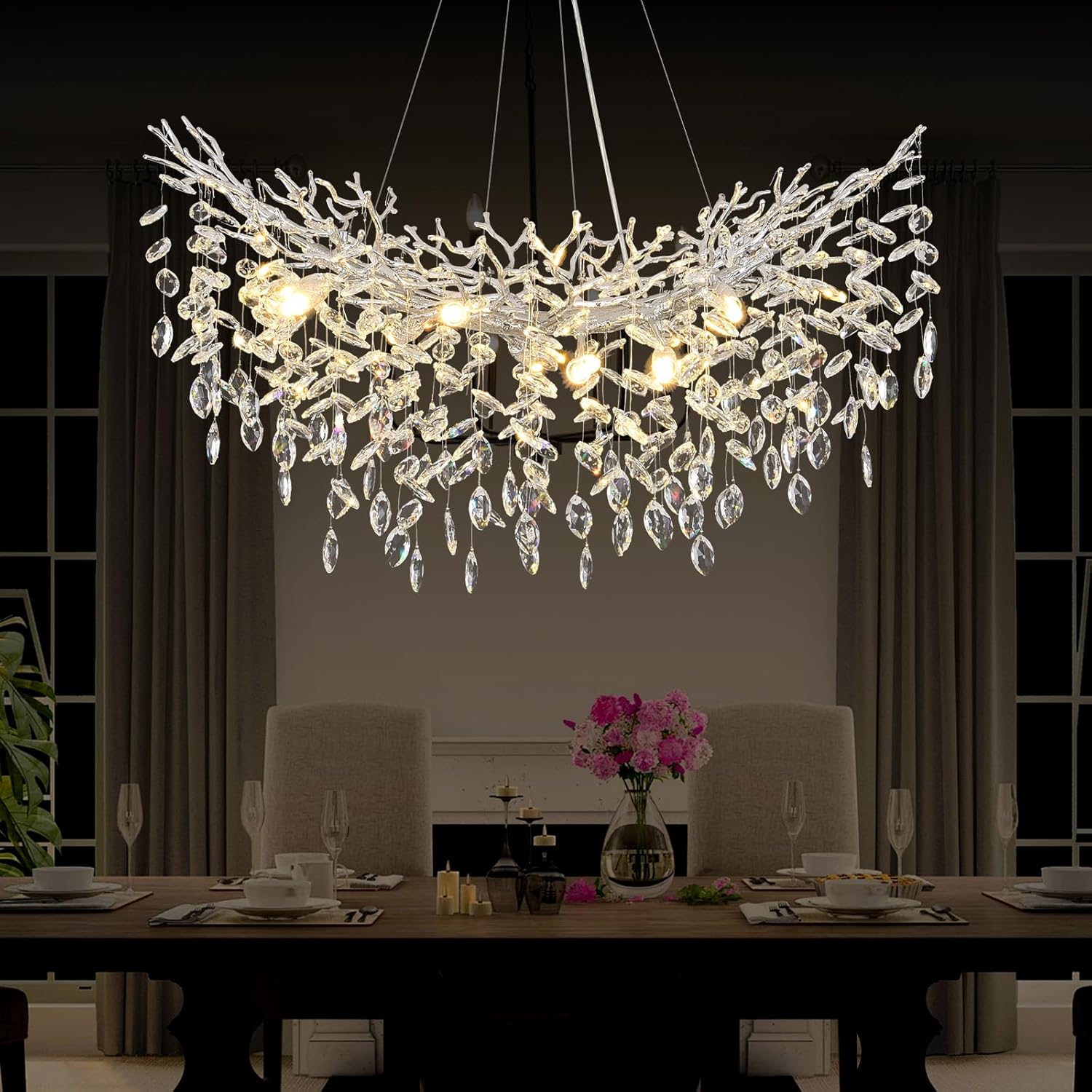 Modern Crystal Silver Chandelier, 36" Large Rectangular Oval Tree Branch Crystal Chandeliers for Dining Room,16-Light Flush Mount K9 Crystal Chandeliers, for Kitchen Island,Dining Room