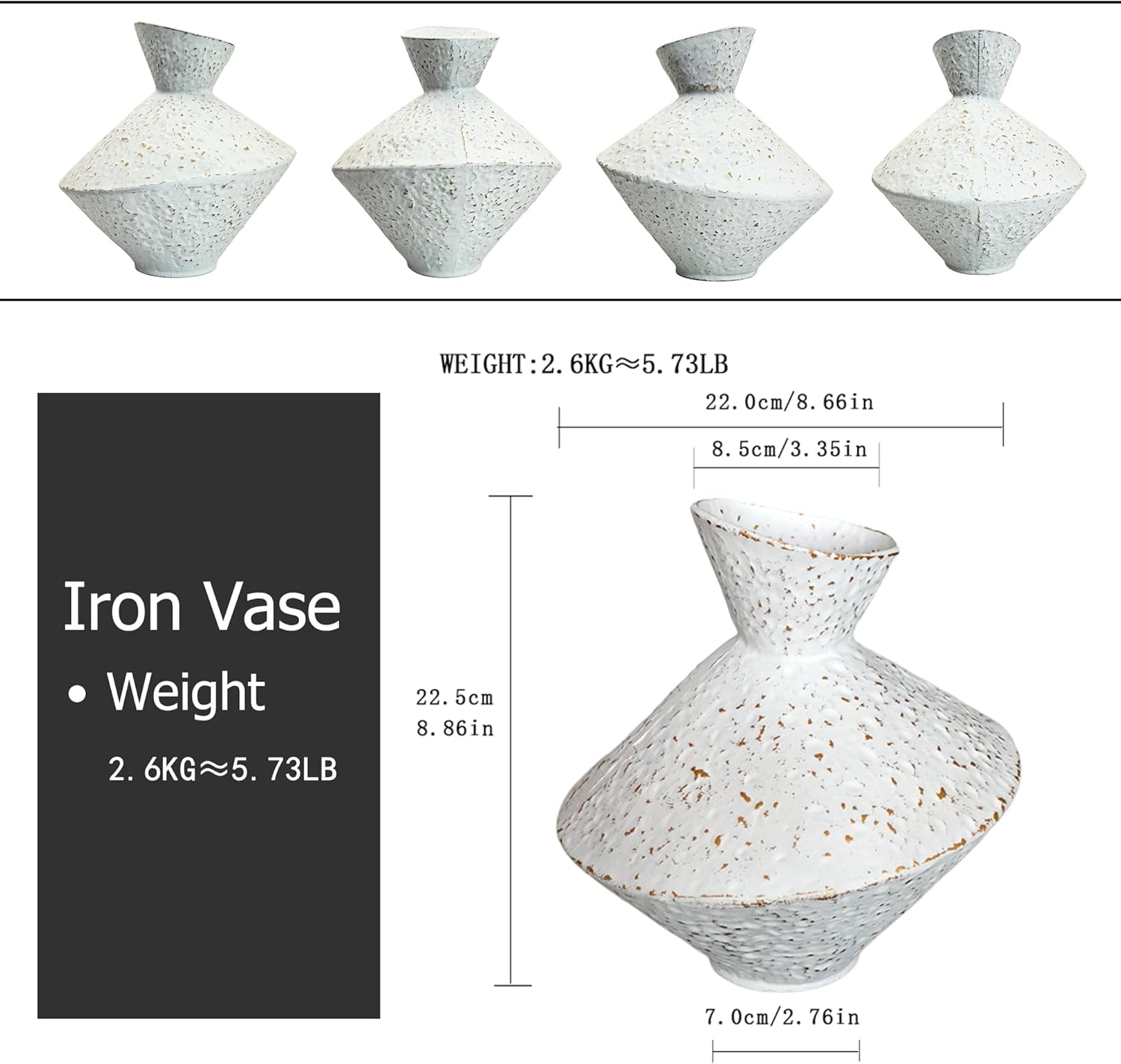 - DESIGN: Unique wabi-sabi inspired cast iron vase featuring a textured, hammered surface with an asymmetrical geometric shape and angled neck