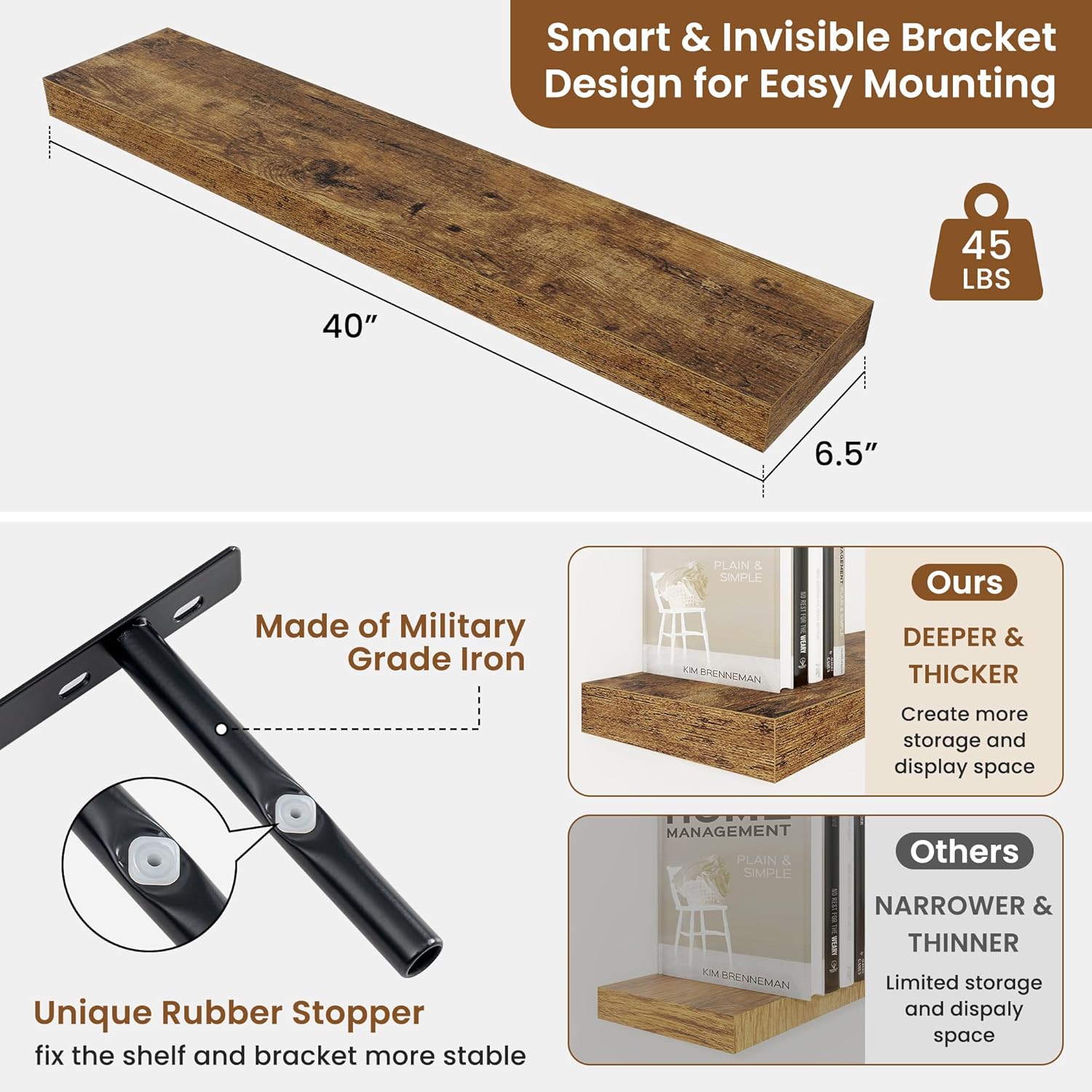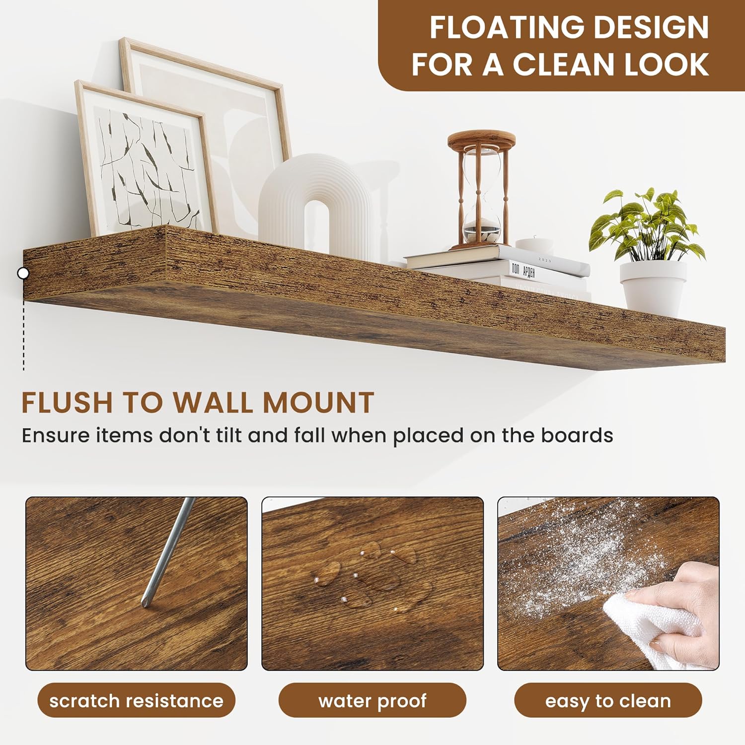 - Well-designed Floating Shelves: Our floating shelves for wall are made of premium engineered wood with a realistic wood grain finish. The rustic wood grain adds warmth and character to any modern or traditional interior. It can organize everyday clutter and make your space tidier, and make it full of aesthetic flare