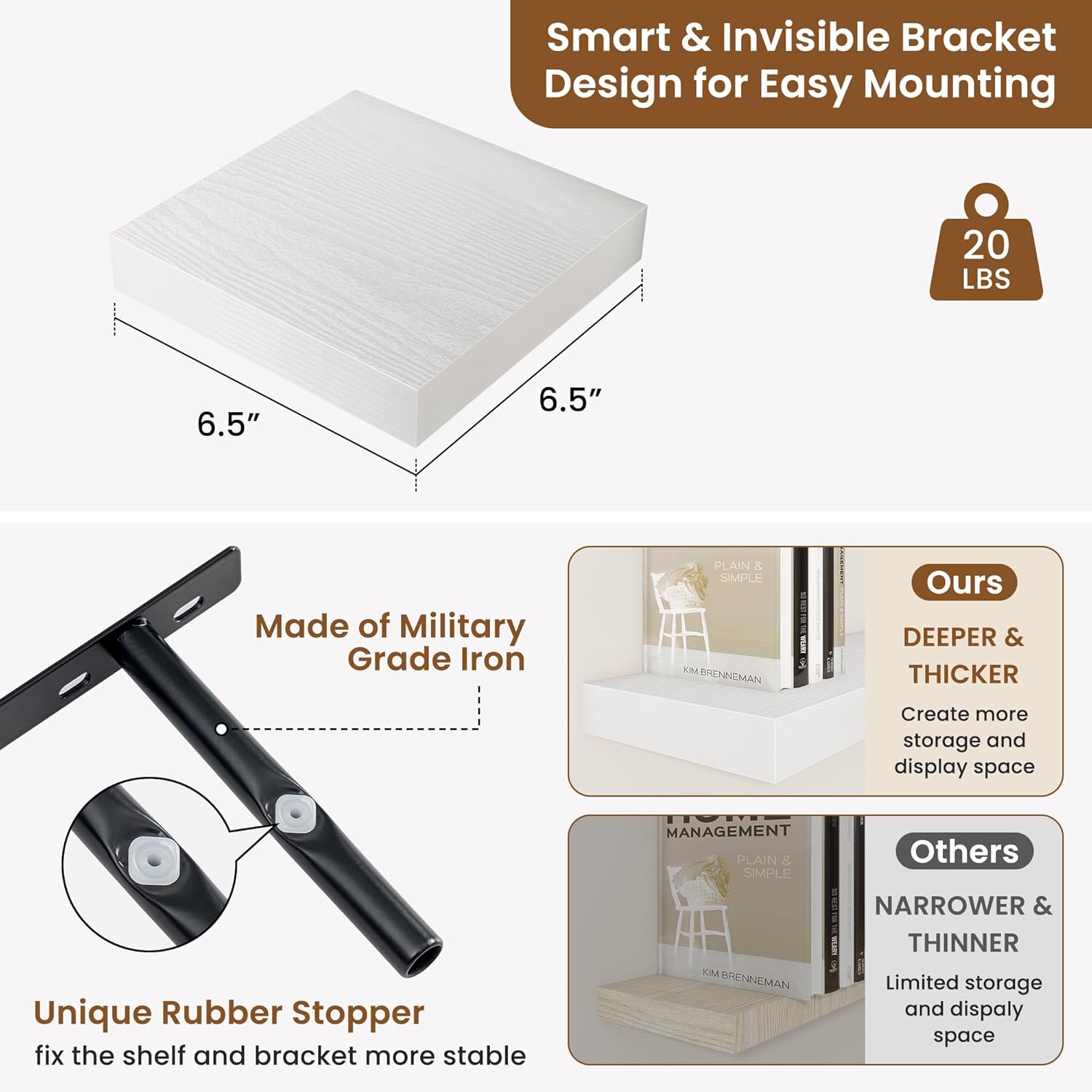 - Well-designed Floating Shelves: Our floating shelves for wall are made of premium engineered wood with a realistic wood grain finish. The rustic wood grain adds warmth and character to any modern or traditional interior. It can organize everyday clutter and make your space tidier, and make it full of aesthetic flare