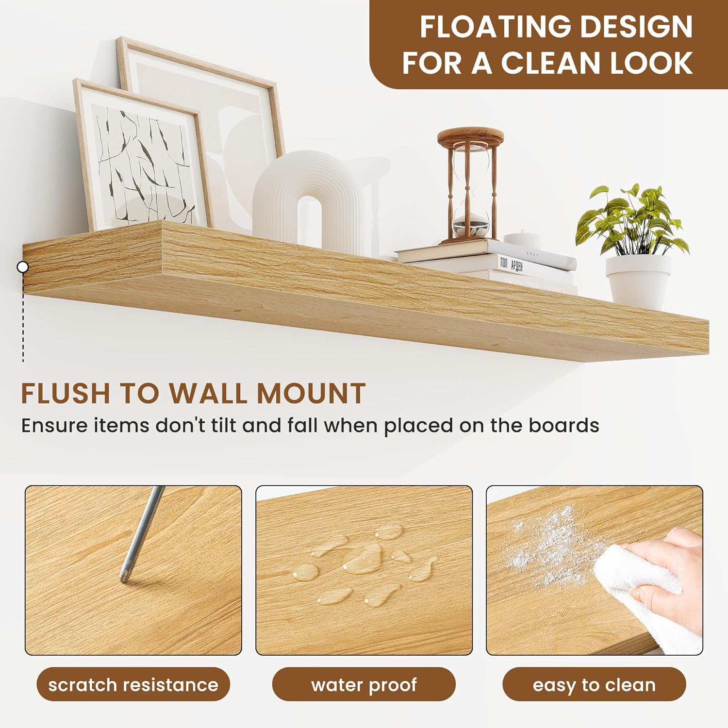 - Well-designed Floating Shelves: Our floating shelves for wall are made of premium engineered wood with a realistic wood grain finish. The rustic wood grain adds warmth and character to any modern or traditional interior. It can organize everyday clutter and make your space tidier, and make it full of aesthetic flare