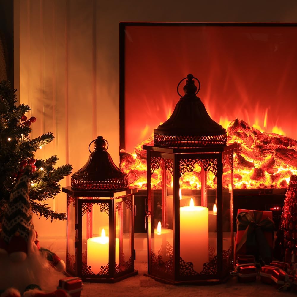 - 【Safe, Windproof & Endlessly Creative】-Featuring six transparent glass panels on each lantern, the design shelters the flame from wind and rain, allowing for the safe use of real flame candles indoors or out(Caution: Top gets hot when lit). For a modern twist, the spacious interior invites you to DIY with Led candles, festive ornaments, or pine cones to create your own unique display.
