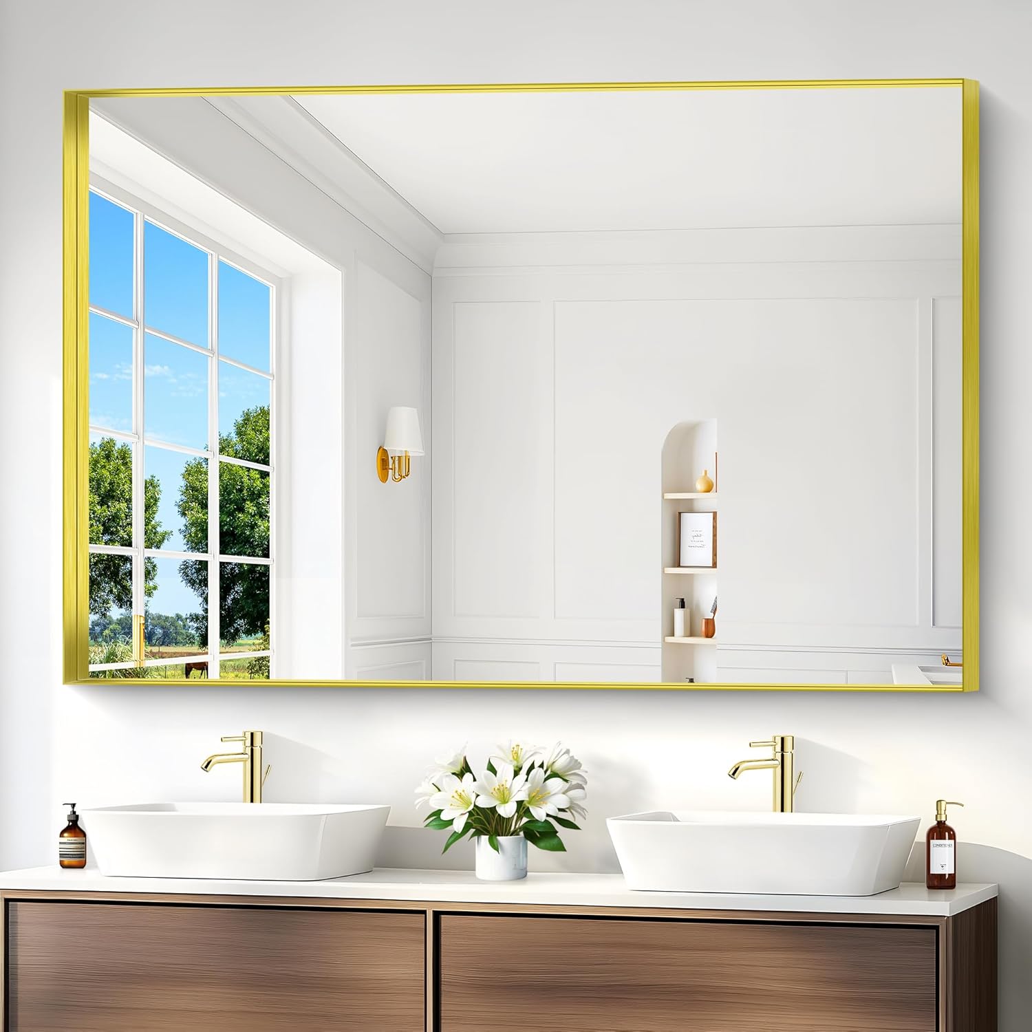 - Crystal-Clear Reflection, Zero Distortion: This gold wall-mounted bathroom mirror delivers a true 1:1 image reflection—no blurring, warping, or distortion. The ultra-durable glass is scratch-resistant and easy to clean, making it the perfect vanity mirror for a sleek, modern bathroom.