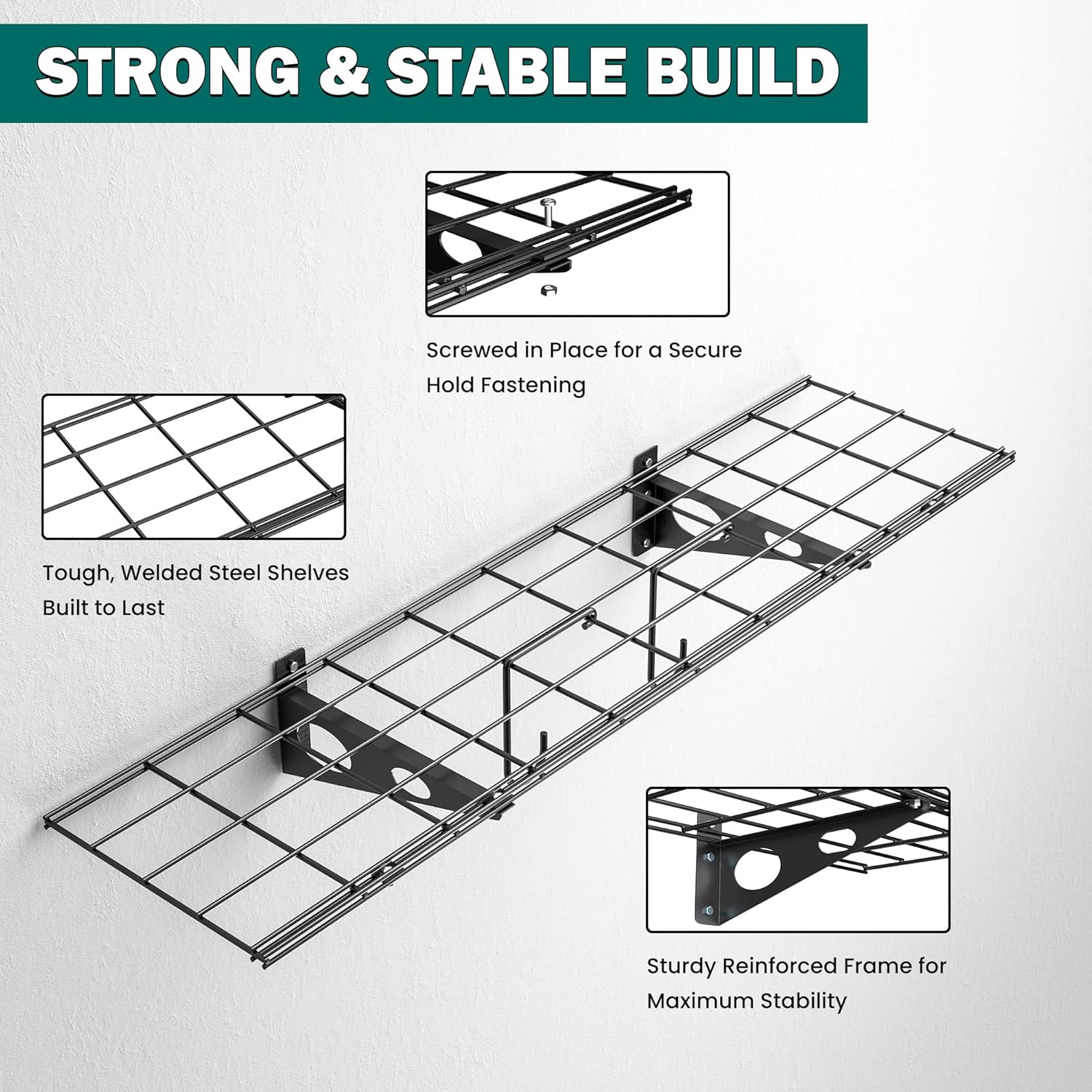 - RUST-PROOF COATED STEEL: Built to last, this wall-mounted shelf is made of high-quality powder-coated steel that resists rust, corrosion. Perfect for garage, basement, and laundry room—even in damp or harsh environment