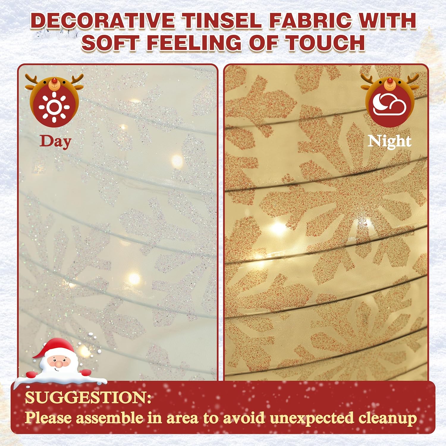 - Premium Quality: Our lighted Christmas decoration is made of a high quality powder-coated steel frame which ensures the long service life. It is durable enough for you to use year over year and it wouldnāt break easily. Decorative tinsel fabric gives you soft feeling while touching it