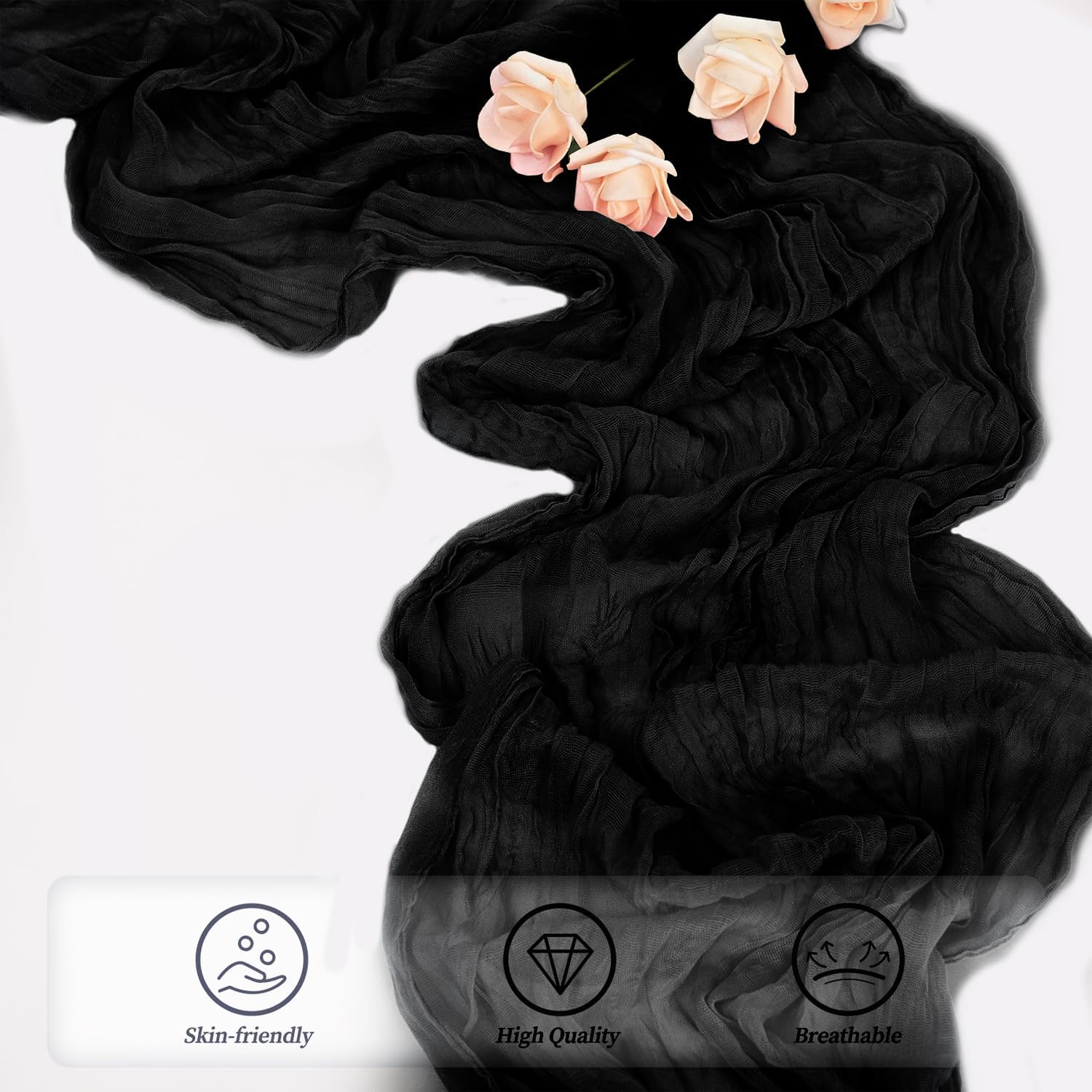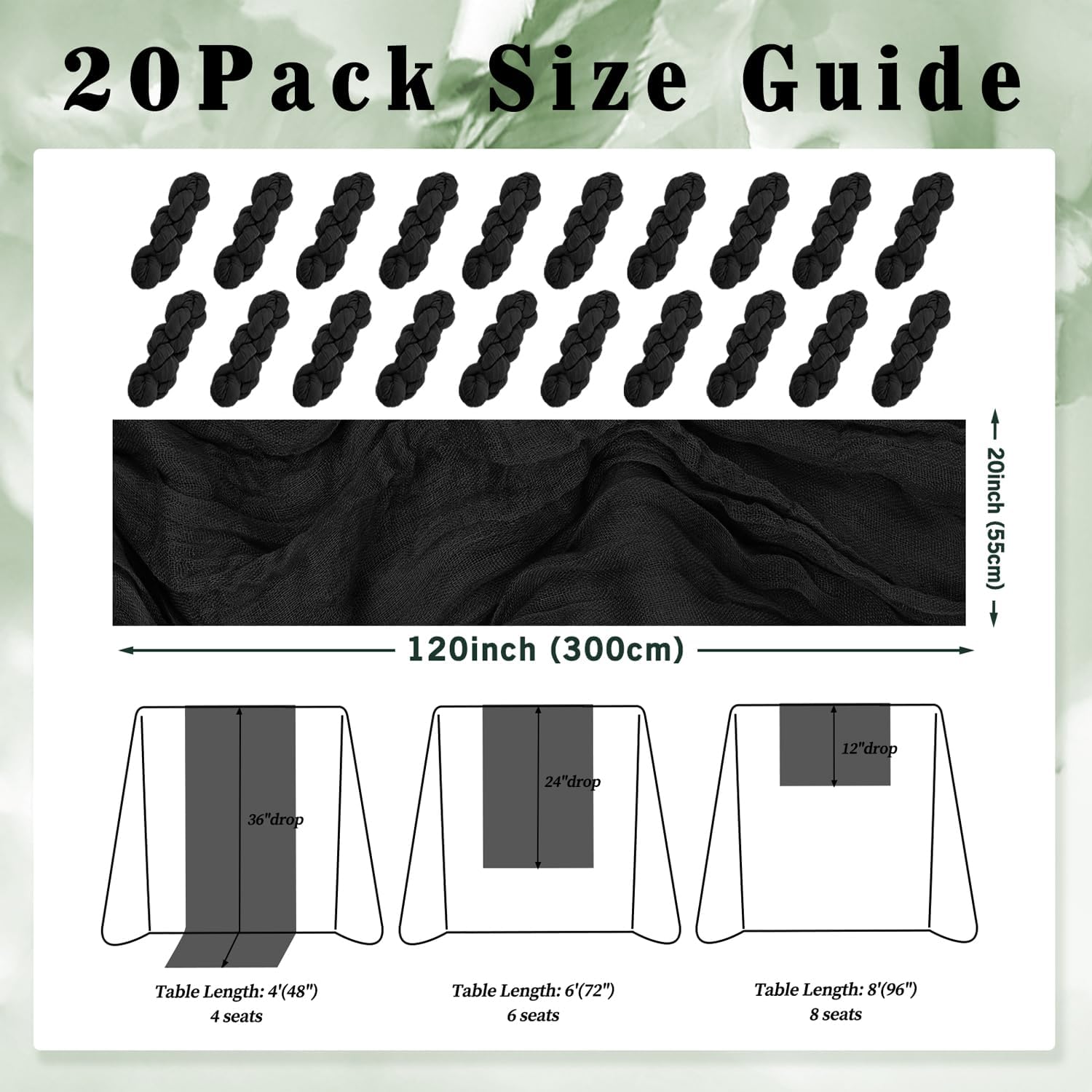 - Cheesecloth Table Runner Size: You will receive 20 black cheesecloth tablerunner, each measuring 20 x 120 inches. The quantity is sufficient for you to decorate various romantic occasions. It can decorate most shaped tables, such as rectangular tables, round tables, and cocktail tables. It is long enough to decorate a large table and be placed perfectly and elegantly on the tabletop, adding a romantic atmosphere to your occasion.