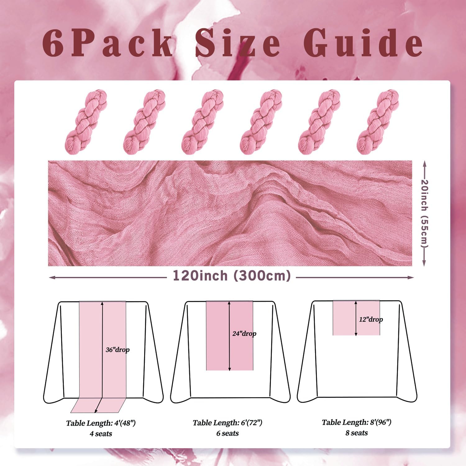 - Cheesecloth Table Runner Size: You will receive 6 dusty rose cheesecloth tablerunner, each measuring 20 x 120 inches. The quantity is sufficient for you to decorate various romantic occasions. It can decorate most shaped tables, such as rectangular tables, round tables, and cocktail tables. It is long enough to decorate a large table and be placed perfectly and elegantly on the tabletop, adding a romantic atmosphere to your occasion.