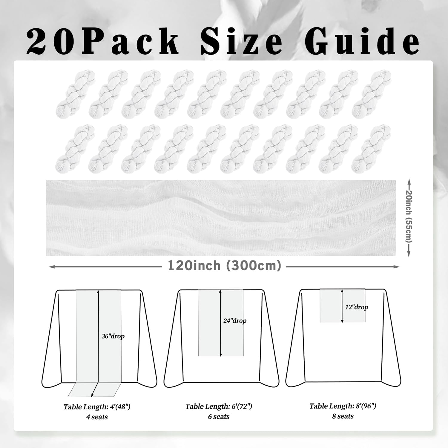 10FT 20 Pack White Cheesecloth Table Runner 20 x 120 Inch Long Rustic Gauze Cheese Cloth Table Runner for Wedding Bridal Baby Shower Table Decorations Boho Fabric Sheer Birthday Party Table Decor