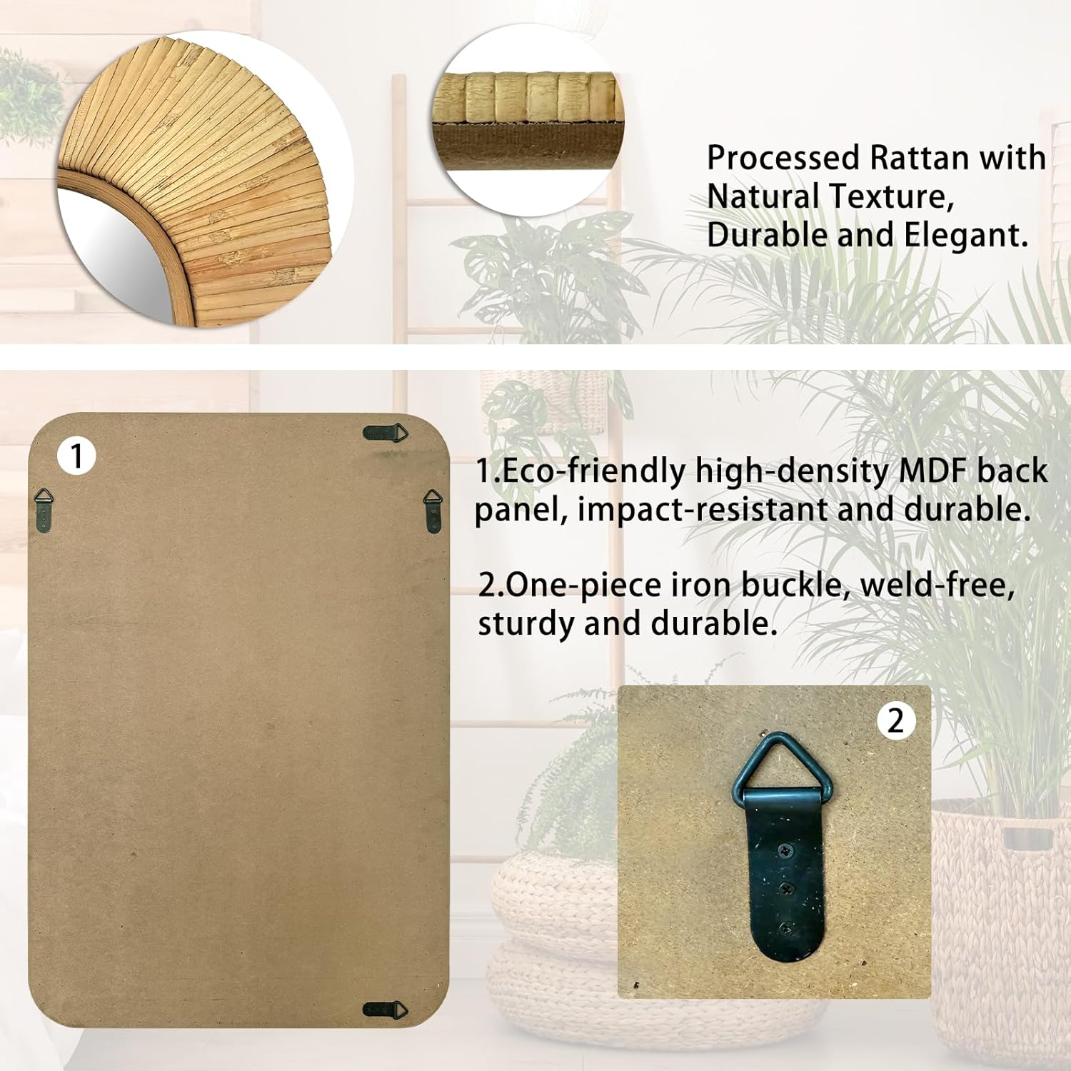 24x36 inch Rattan Rectangular Mirror for Wall, Bohemia Bathroom/Farmhouse Boho Mirrors, Vanity Irragular Decorative Mirror, Suitable for, Nursery, Bedroom, Living Room, Home Decoration