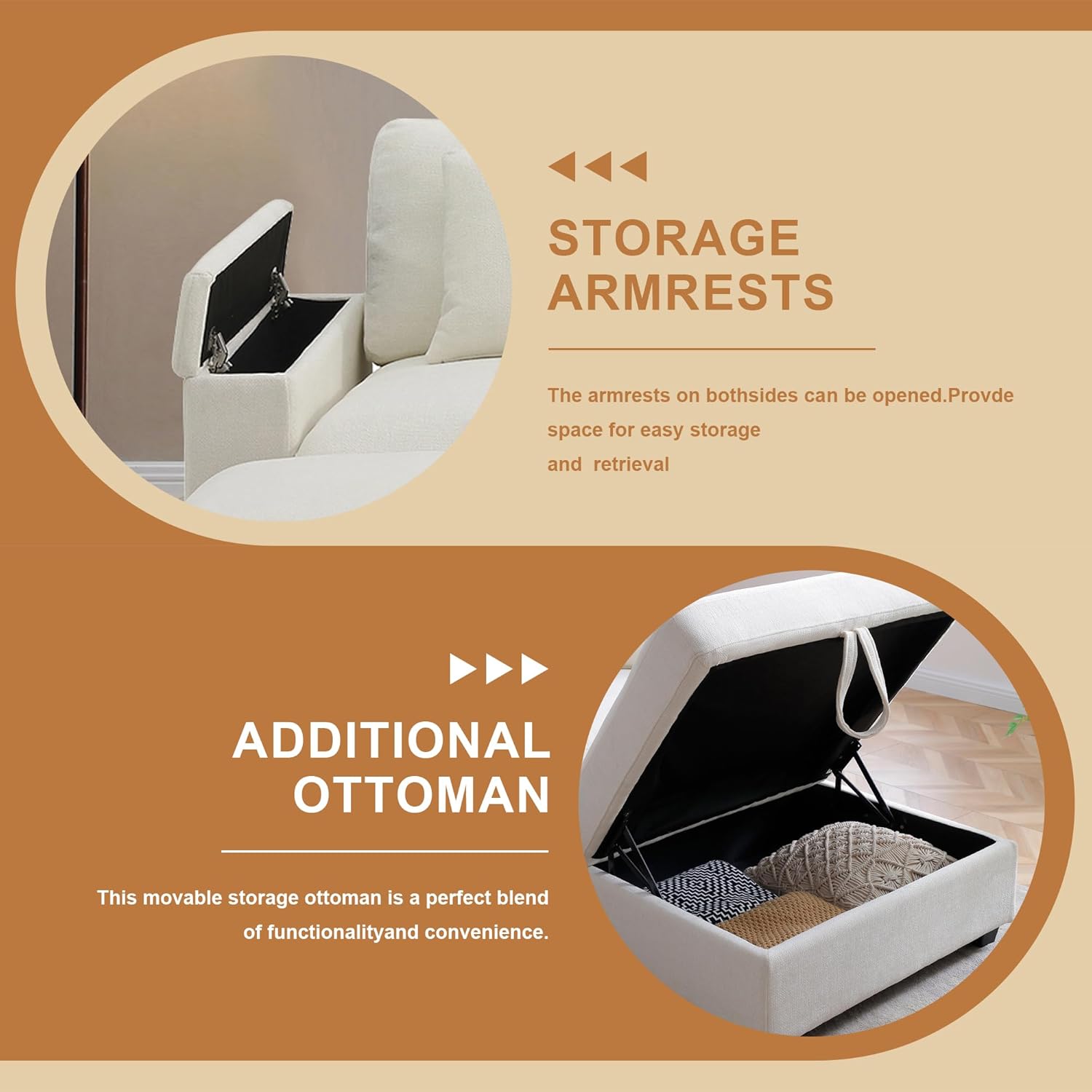 - STORAGE SOLUTIONS: Includes a movable storage ottoman and built-in storage armrest to keep living space organized and clutter-free