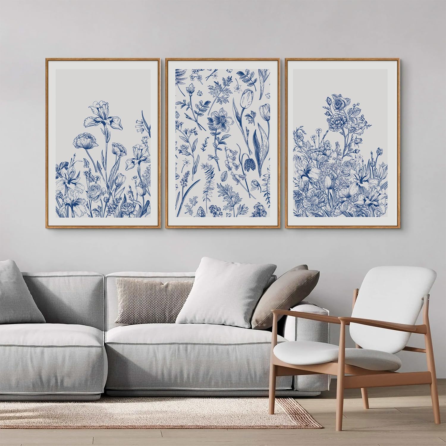 SIGNINART Classic Chinoiserie Botanical Framed Canvas Wall Art, Blue and White Floral Wall Decor, Minimalist Flower Artwork, Navy Blue Wildflower Art Painting for Bedroom Living Room Office 24"x36"x3