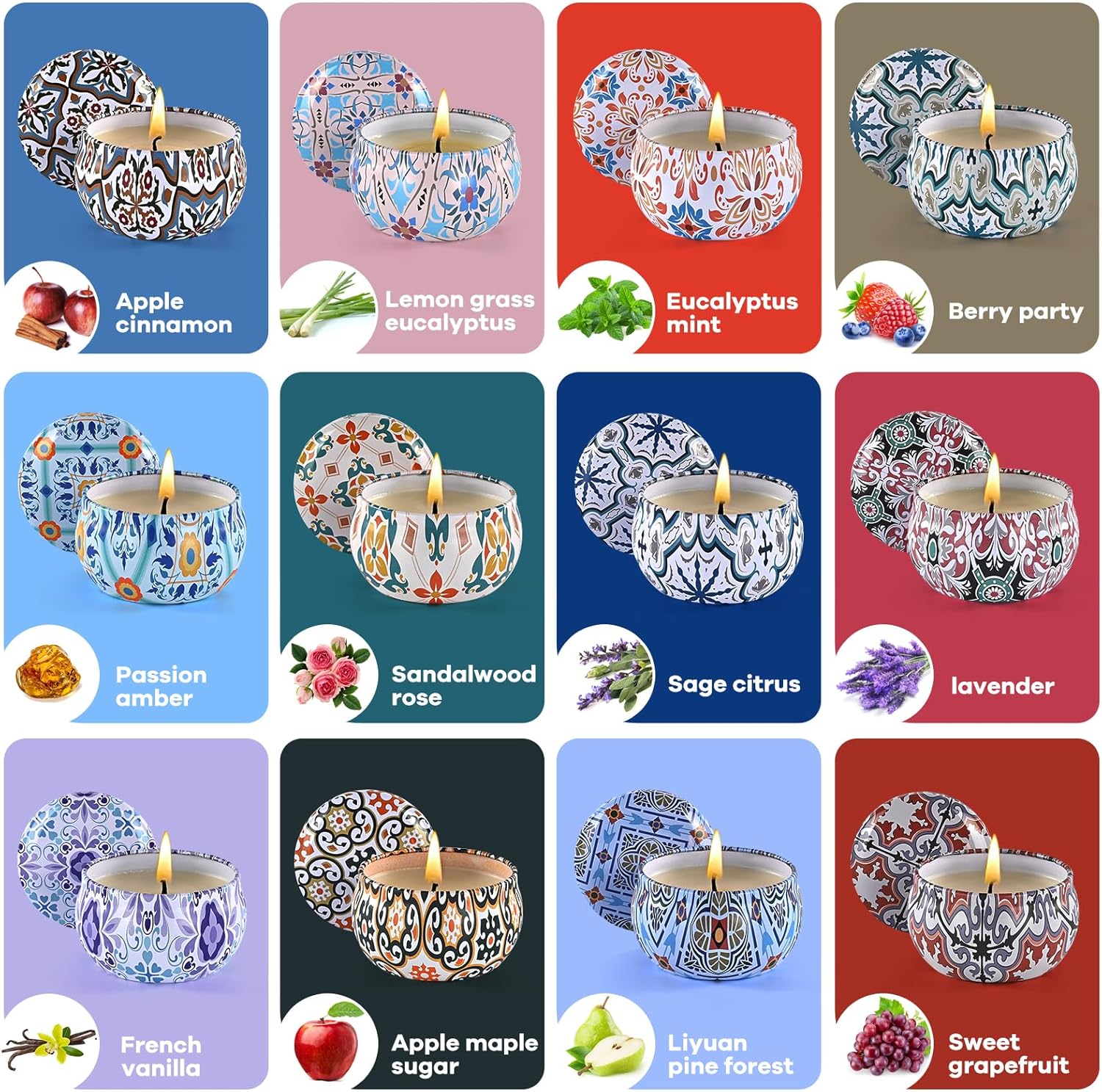 - Various Scented Candles Available: Contains 12 Scents: Baies, French Vanilla, Apple Cinnamon, Lavender, Grapefruit, Sage Citrus, Passionate Amber, Eucalyptus Mint, Pear Orchard & Pine Grove, Apple Maple Syrup, Lemongrass& Eucalyptus, Sandalwood Rose, Whether you're looking for something bold and masculine or soft and comforting, there's a fragrance waiting to be discovered