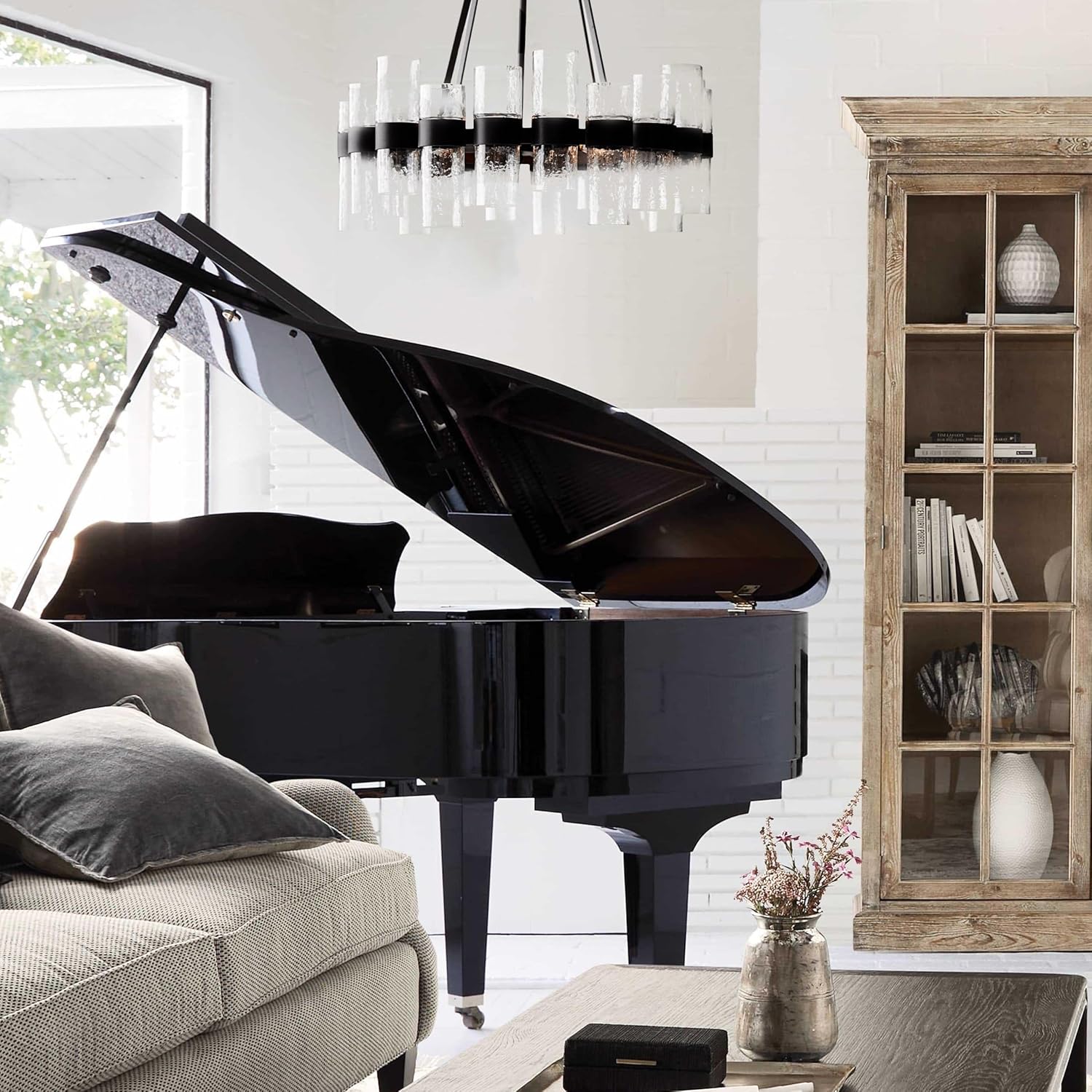 - [Unique Design] Enhance your decor with our industrial glass tube round chandelier, merging modern style with industrial appeal. Each mouth-blown glass piece is handcrafted by artisans, blending traditional techniques with contemporary design for a striking focal point