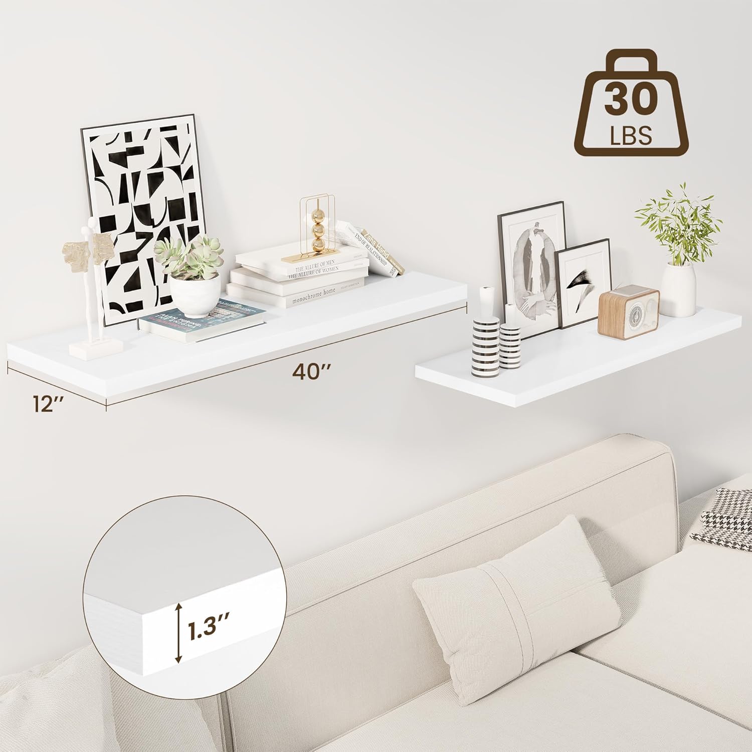40" Floating Shelves for Wall, 12" Deep Slim White Floating Shelves, Wall-Mounted Shelves for Bedroom, Living Room, Kitchen, Bathroom - Set of 2
