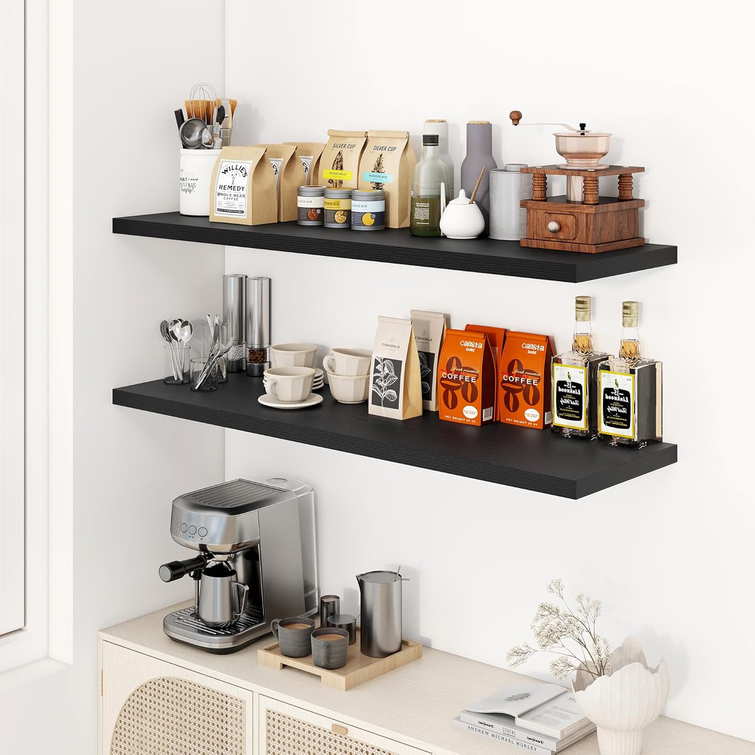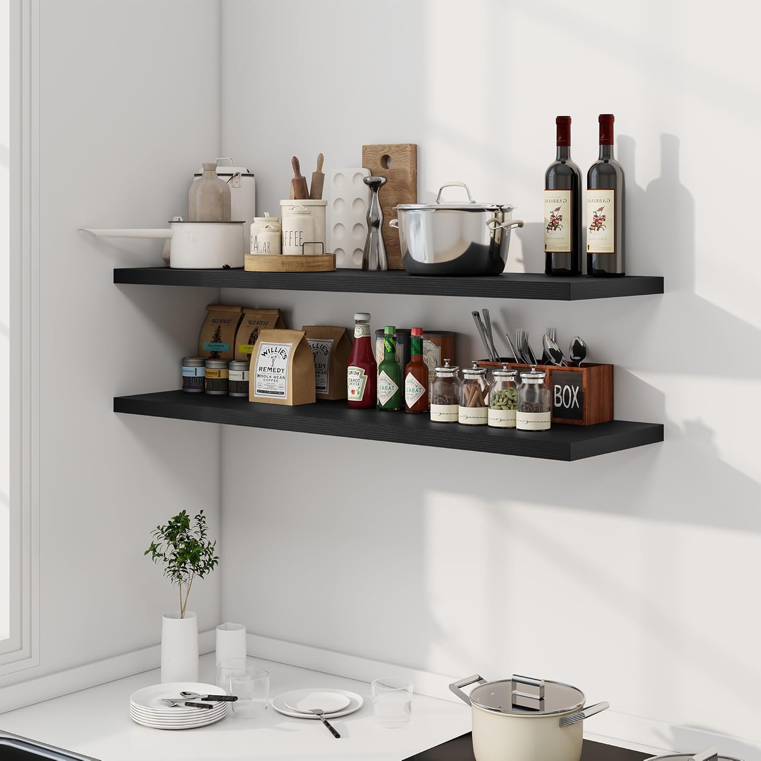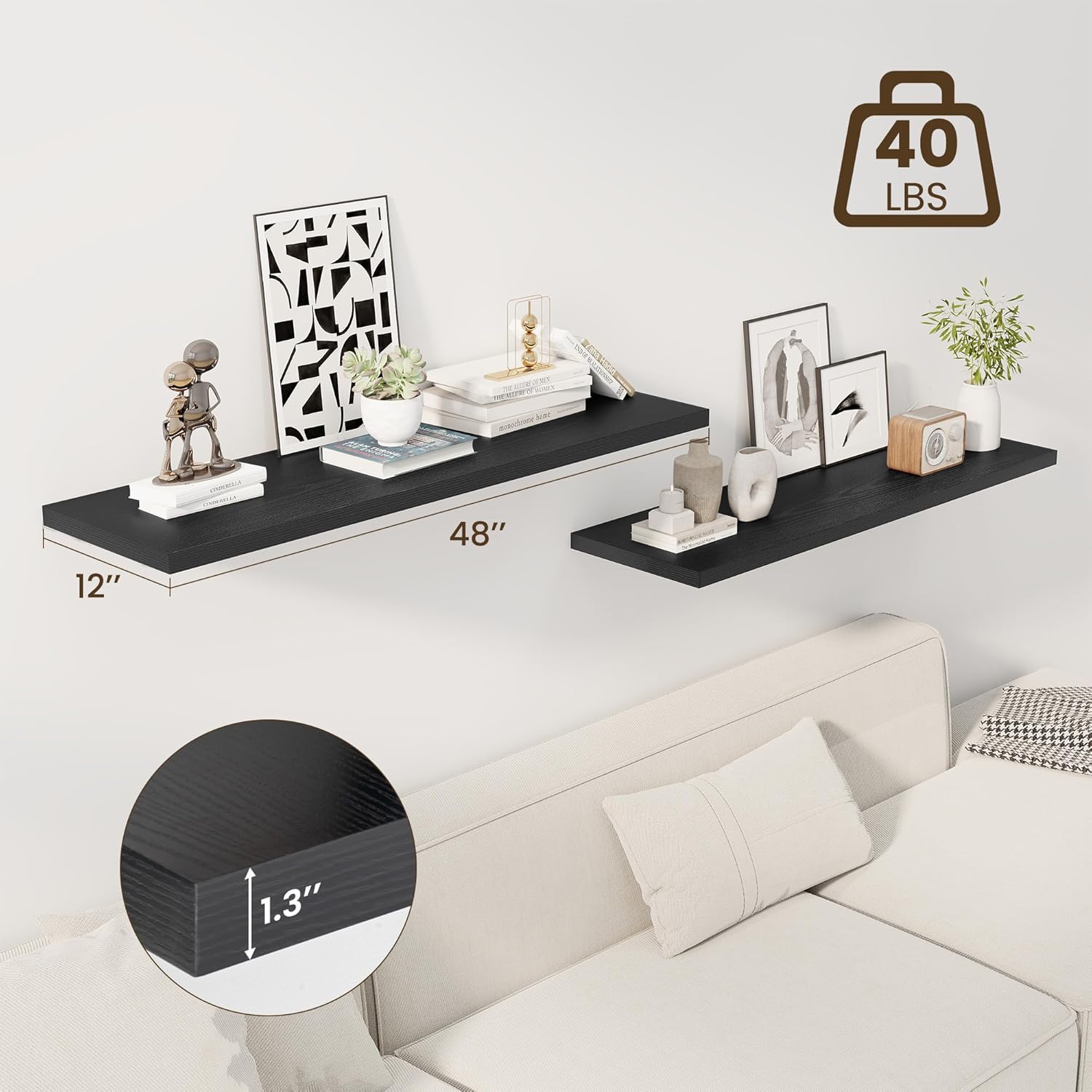 48" Floating Shelves for Wall, 12" Deep Slim Black Floating Shelves, Wall-Mounted Shelves for Bedroom, Living Room, Kitchen, Bathroom - Set of 2