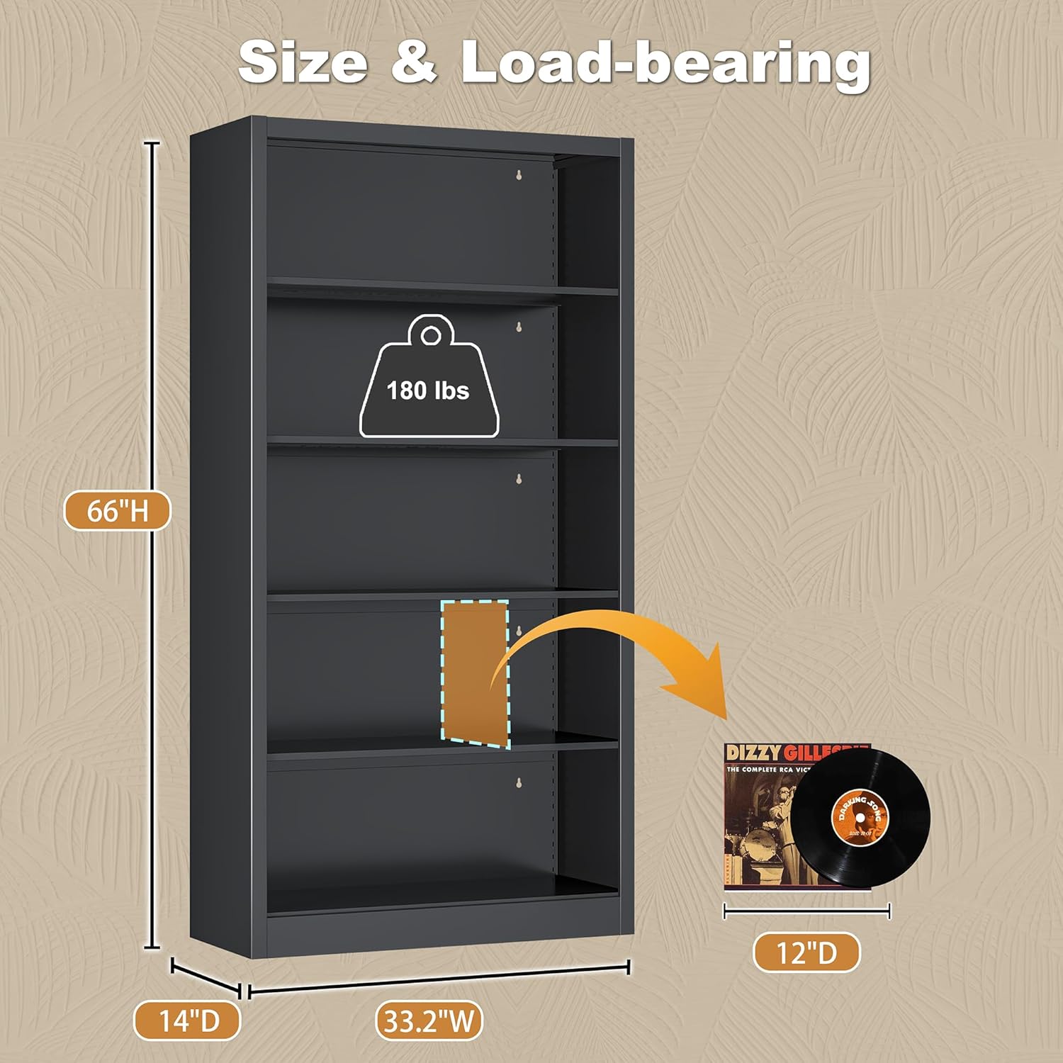- 【Metal Bookshelves and Bookcases】The tall bookshelf is stable, sturdy, and durable. Each shelf of metal shelf can support up to 180 pounds without sagging or bending over time. More sturdy and durable than wooden bookcases, does not emit formaldehyde, and has a longer lifespan. Adjustable 5 tier bookshelves can change the size and quantity of storage space. You can safely place large items and hand them over to metal shelves.