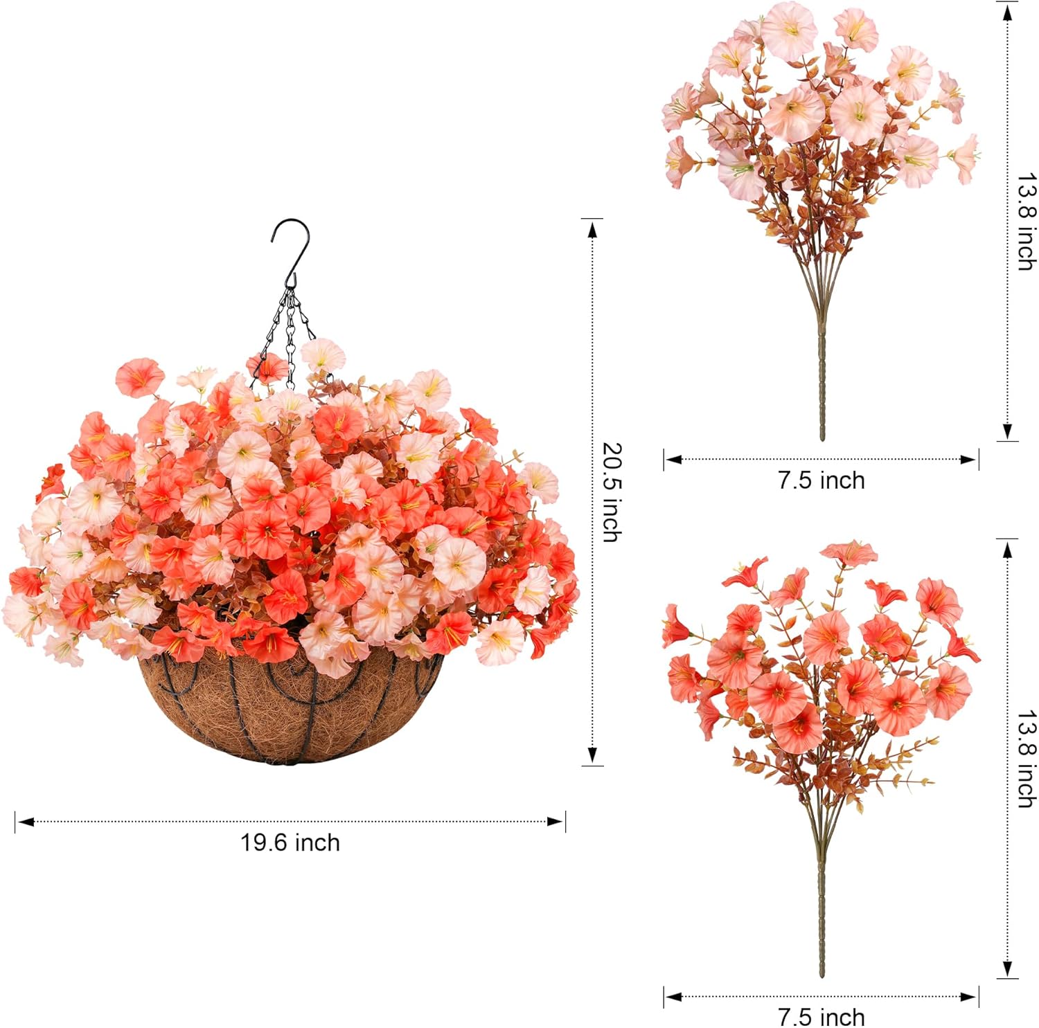 - Artificial Hanging Flowers Basket with Morning Glory: Package include 12 bundles realistic silk morning glory match with green eucalyptus leaves, 1 Hanging Basket with chain, 1 foam, 1 green hat. Enjoy vibrant blooms year-round, regardless of the season or weather conditions.