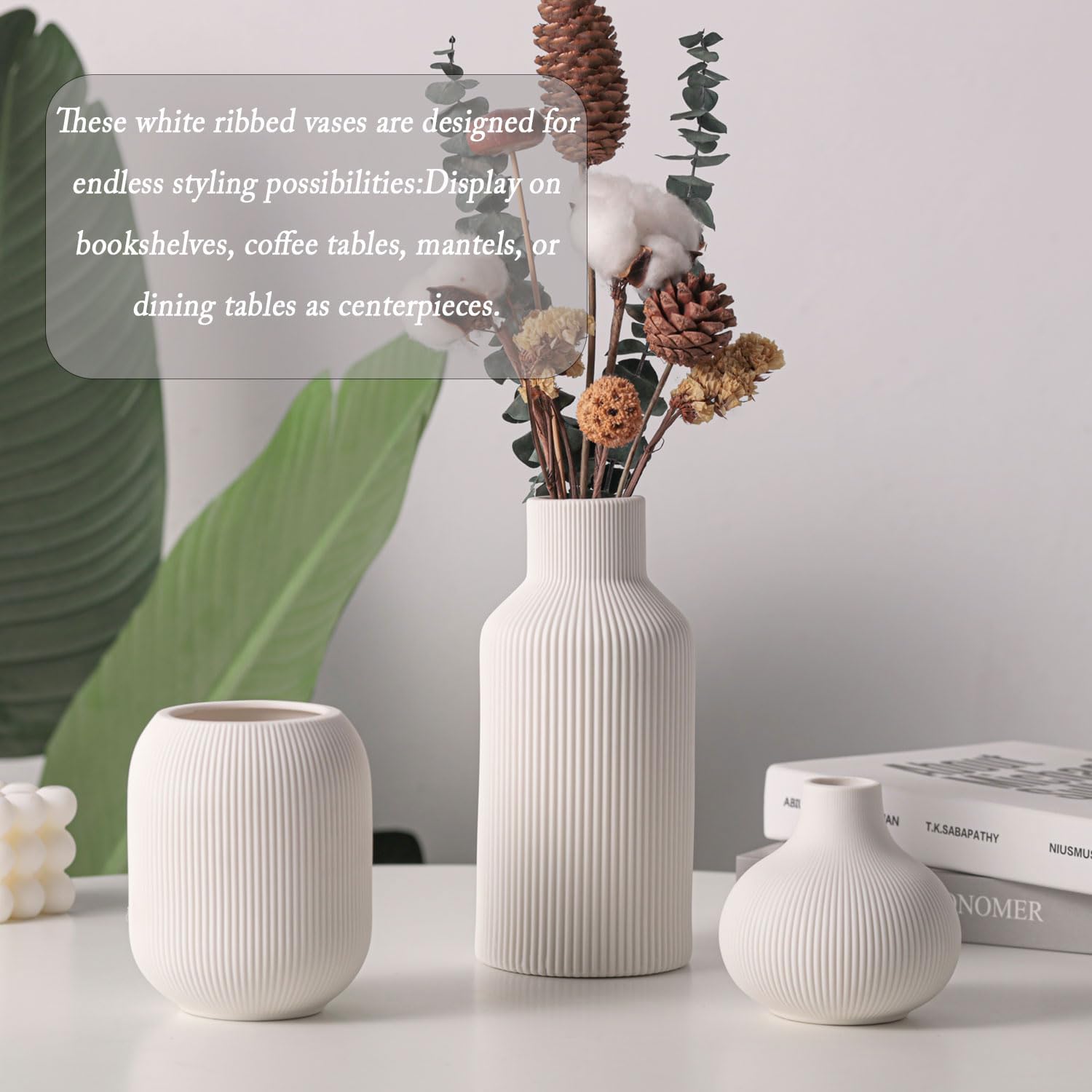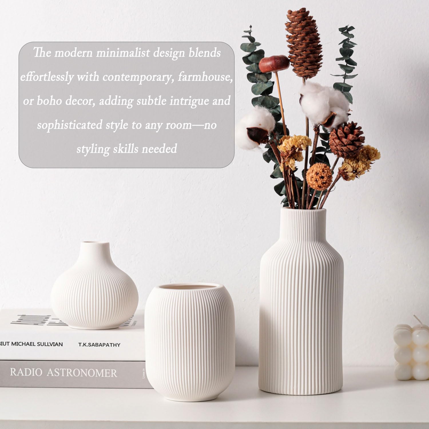 - Modern Ribbed Texture & Minimalist Design:Elevate your space with this set of 3 ceramic vases featuring ribbed texture and a sleek matte white finish. The modern minimalist design blends effortlessly with contemporary, farmhouse, or boho decor, adding subtle intrigue and sophisticated style to any roomāno styling skills needed. Perfect as standalone accents or paired with faux/fresh flowers for a touch of elegance.