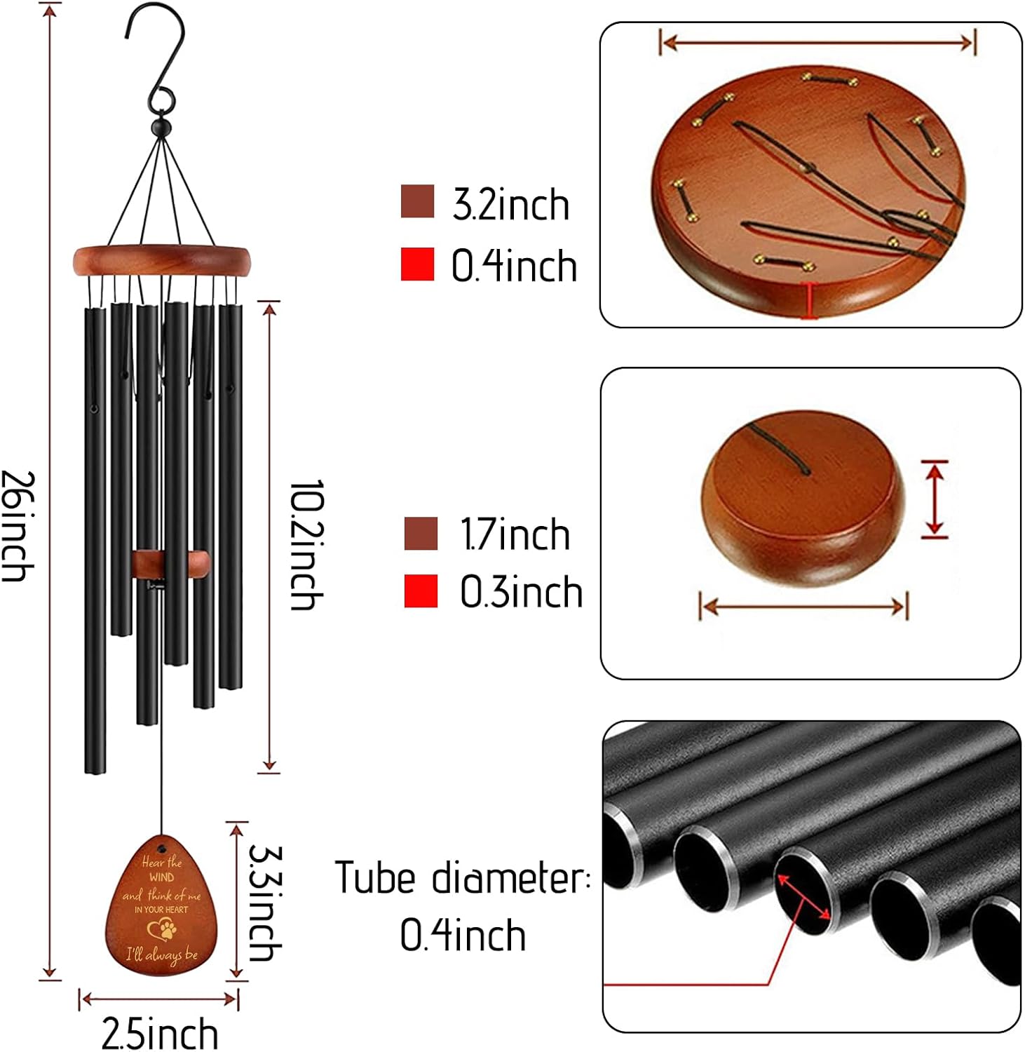 - Premium Material:This pet memorial wind chime measures approximately 26 inches in total height. It is made of Premium Pine wood and 6 thickened aluminium tubes, which is not easy to wear out and fade and rust. You can hang it outdoors without worrying about it getting damaged