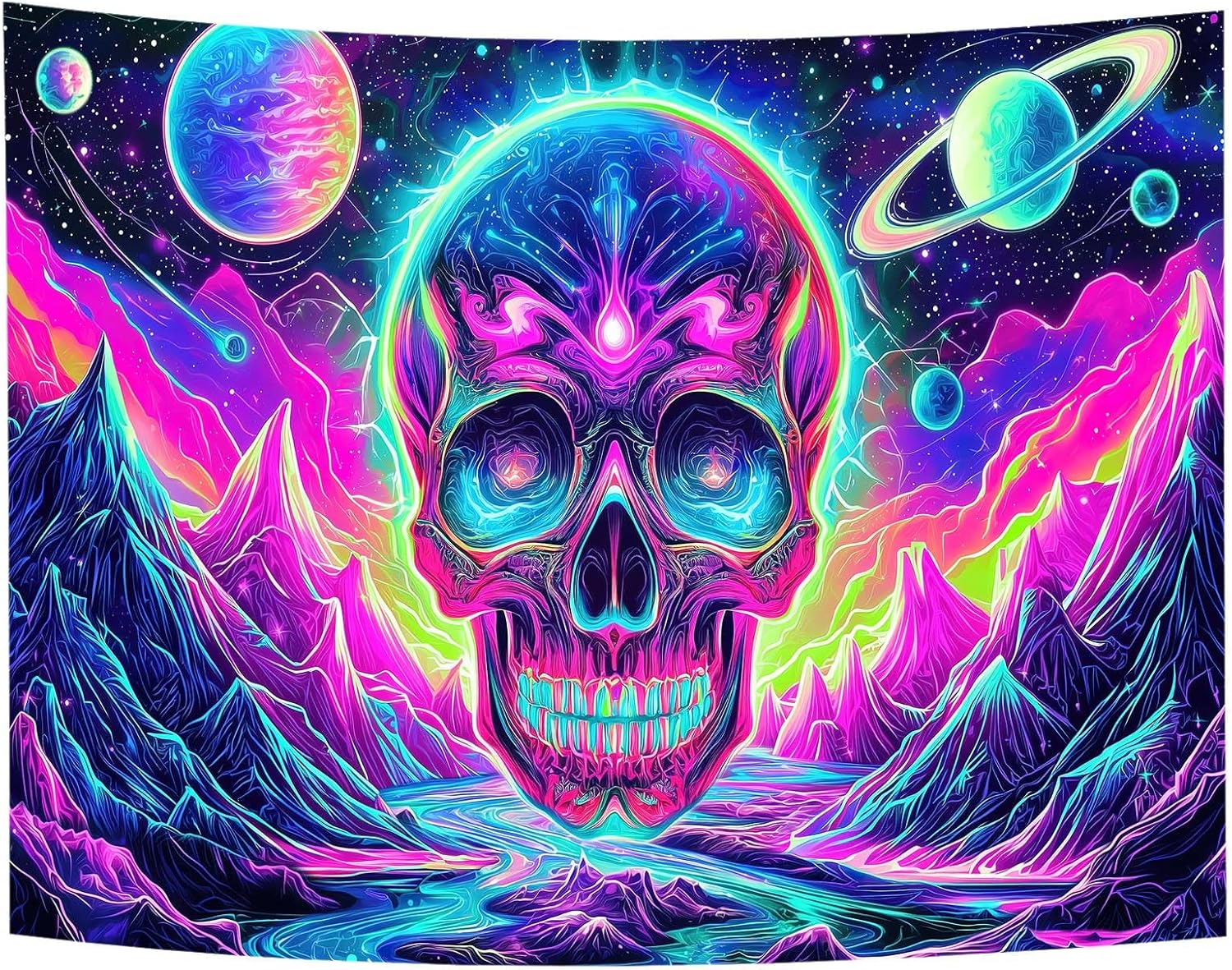 Blacklight Skull Tapestry, UV Reactive Gothic Skeleton Mountain Galaxy Planet Wall Hanging Tapestries, Glow in the Dark Horror Face Halloween Aesthetic Poster for Bedroom Living Room Decor 90X70IN