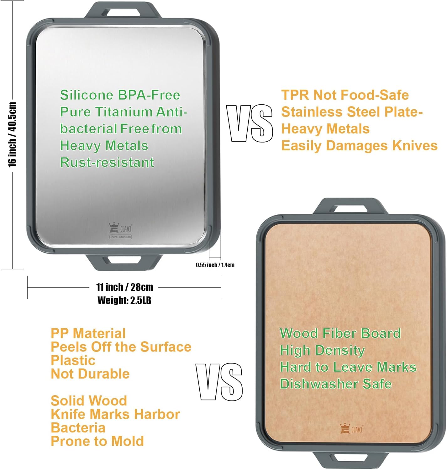 GUANCI Pure Titanium Cutting Board, Double Sided Cutting Board for Kitchen, Pure Titanium/Wood Fiber Composite with Juice Groove Dishwasher Safe 16"L x 11"W