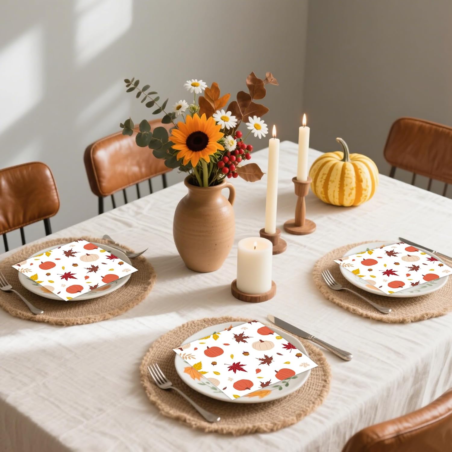 - š½Package Includes: This package contains 50 pieces of fall-themed paper luncheon napkins. The elegant autumn patterns, featuring pumpkins and leaves, bring a festive touch to your gatherings while providing ample quantity for your needs.