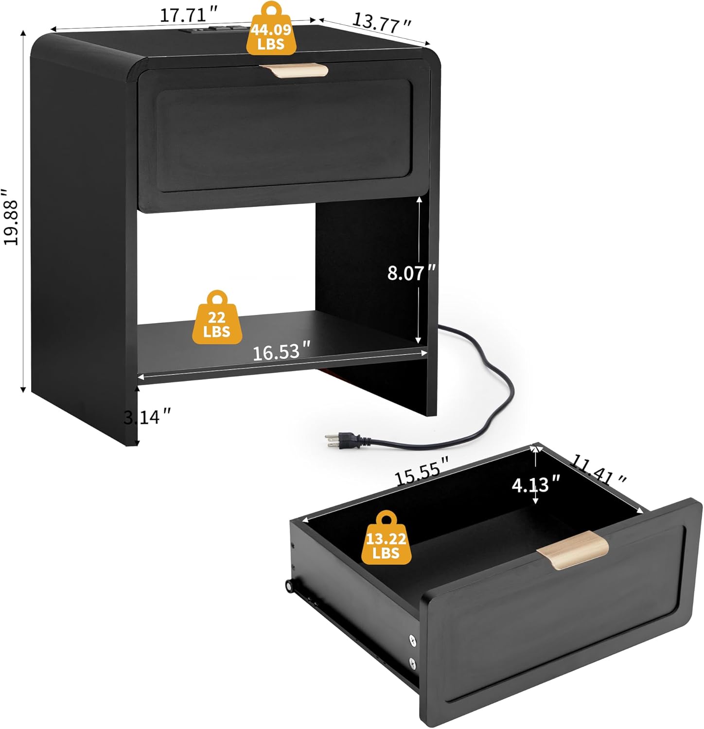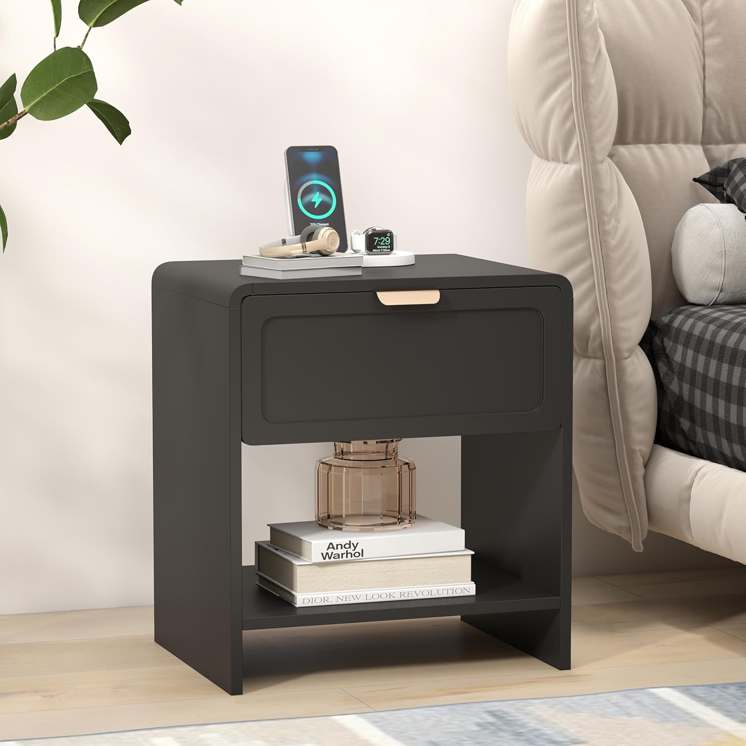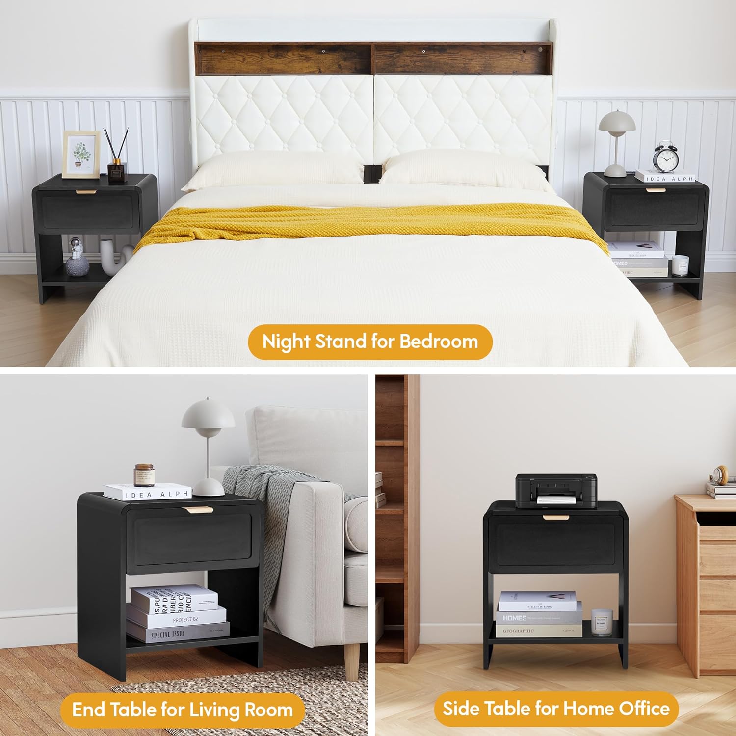 LEVNARY Nightstand Set of 2, Mid-Century Modern Bedside Table with Charging Station and Curved Top Corners, Wooden End Table for Farmhouse Bedroom Living Room (2, Black)
