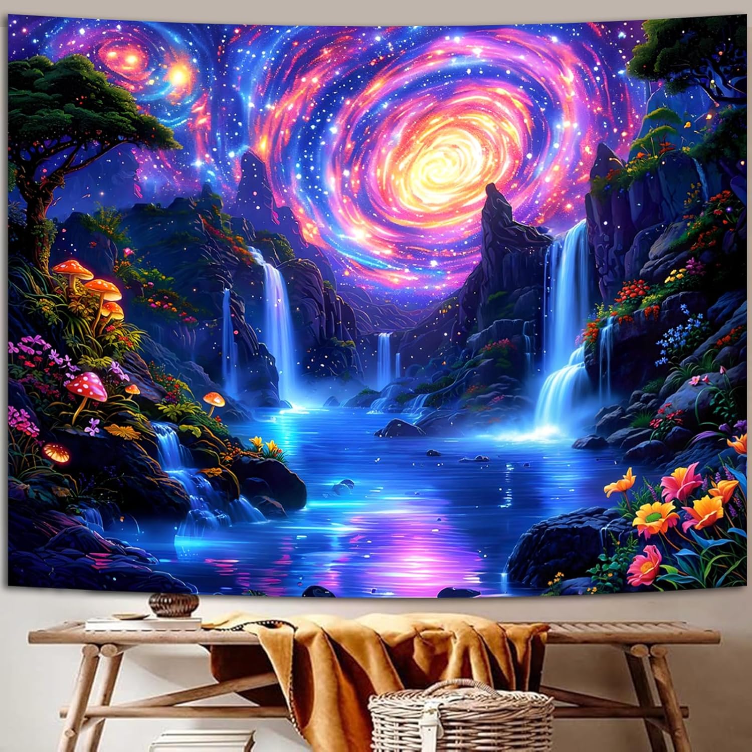 Manicer Blacklight Galaxy Waterfall Neon Tapestry – UV Reactive Glowing Cosmic Spiral Sky Glow in the Dark Nature Fantasy Landscape Wall Art for Bedroom – 51.2" x 59.1"