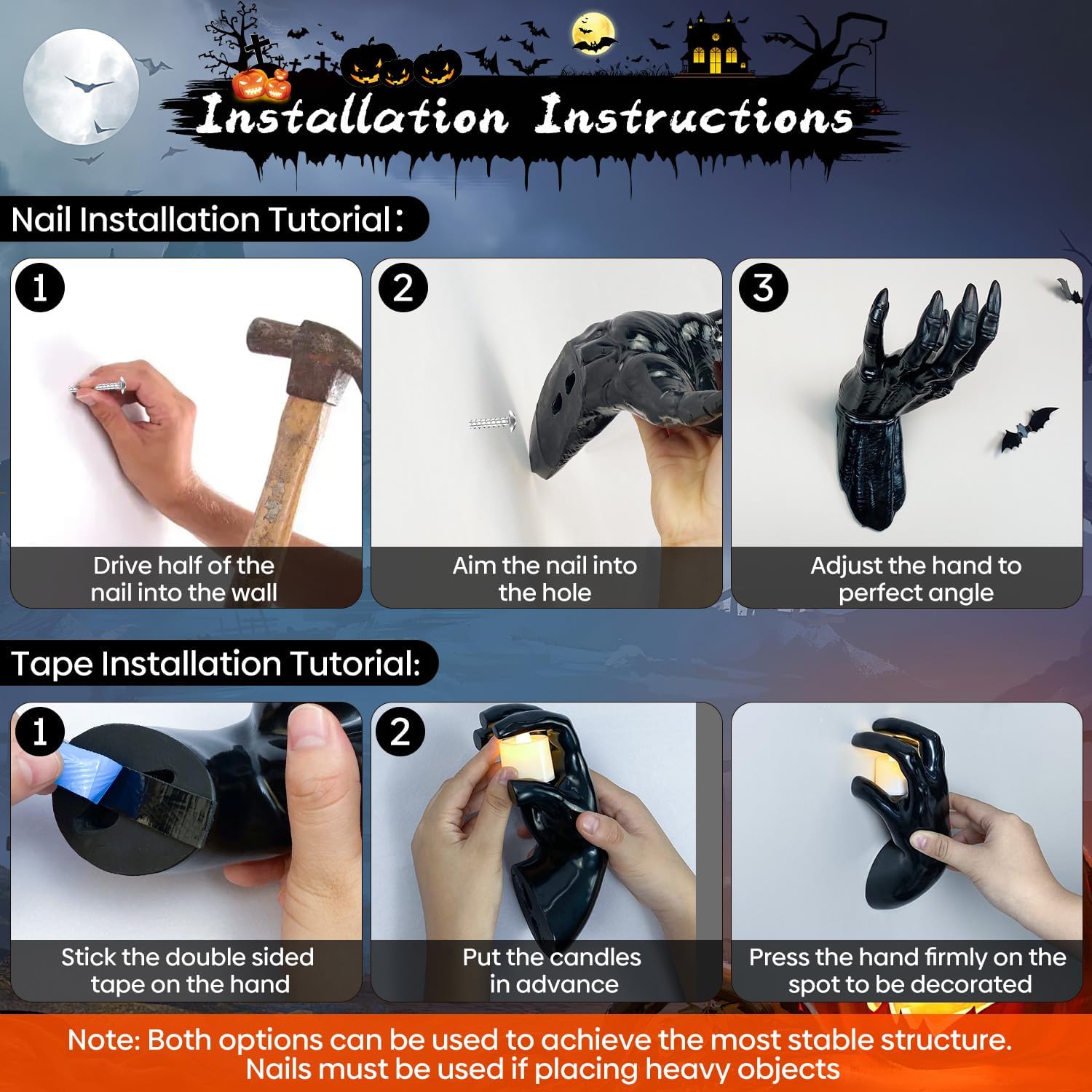 - Versatile Mounting Options for Any Setting: Choose between permanent screw mounting (includes 8 screws) or temporary tape installation (16 double-sided strips) for flexible setup. Ideal for both seasonal Halloween displays and permanent gothic decor. Includes an instruction booklet for quick, hassle-free installation in minutes.