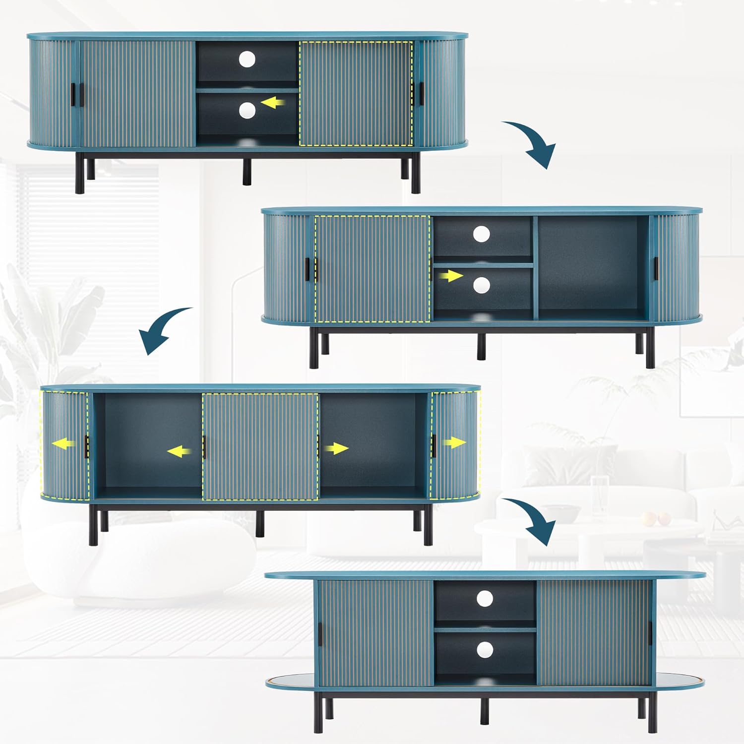 62" Tambour Door TV Stand,Wood Mid Century Modern TV Cabinet for Up to 75“ TV,Curved Edge Long TV Stand with Storage for Bedroom Living Room(62.2inch,Blue)