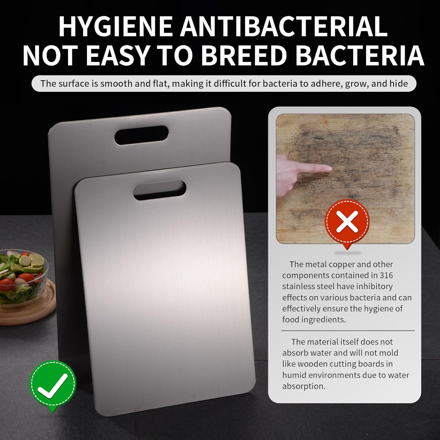 - Preserves Your Health: Our board is crafted from Pure, Medical-Grade Titanium, the same material trusted in most surgical implants. Unlike wooden boards, when the kitchen knife cuts, there will be no cuts, grooves & punctures on our boards, and this board doesnāt absorb liquids,cutting is very quiet, making it the safest choice for your kitchen.