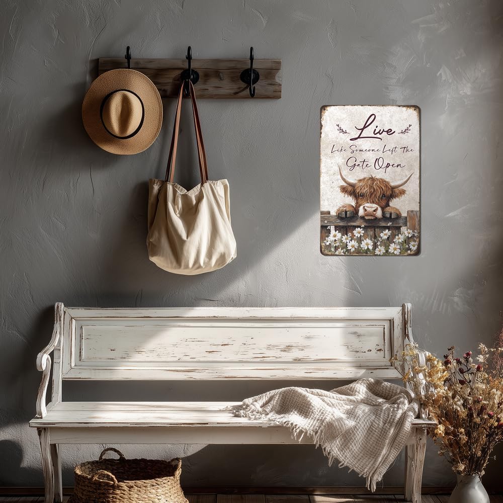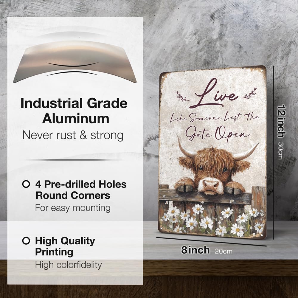 Heuhuww Vintage Highland Cow Decor-Live like Someone Left the Gate Open Tin Sign Farmhouse Wall Art for Home Office Bathroom Highland Cow Gifts 12" x 8"(H17)