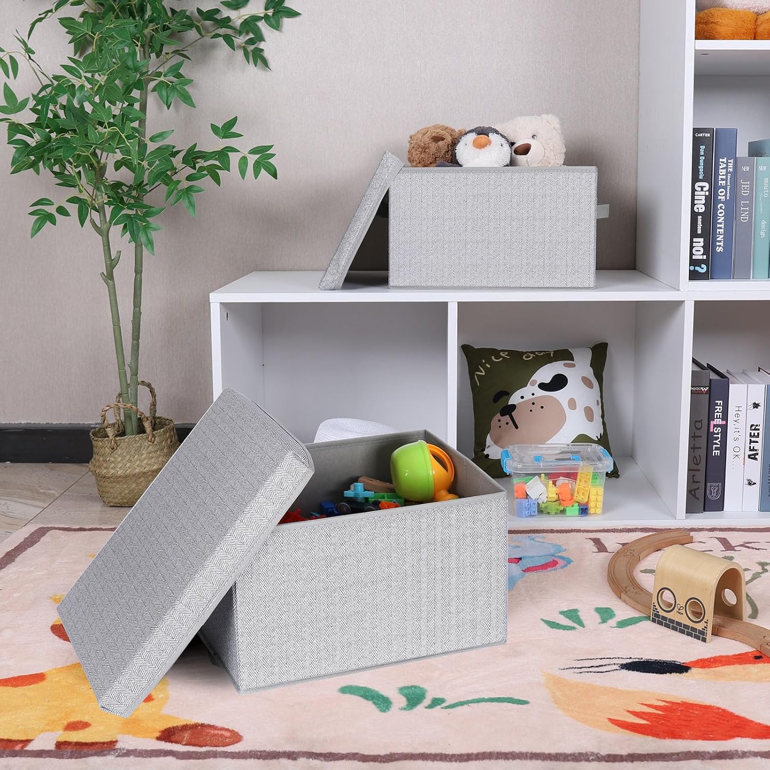 - Practical Design: The fabric storage bin features a lid to minimize dust entry, two sturdy side handles for easy portability, and a collapsible construction that saves space.