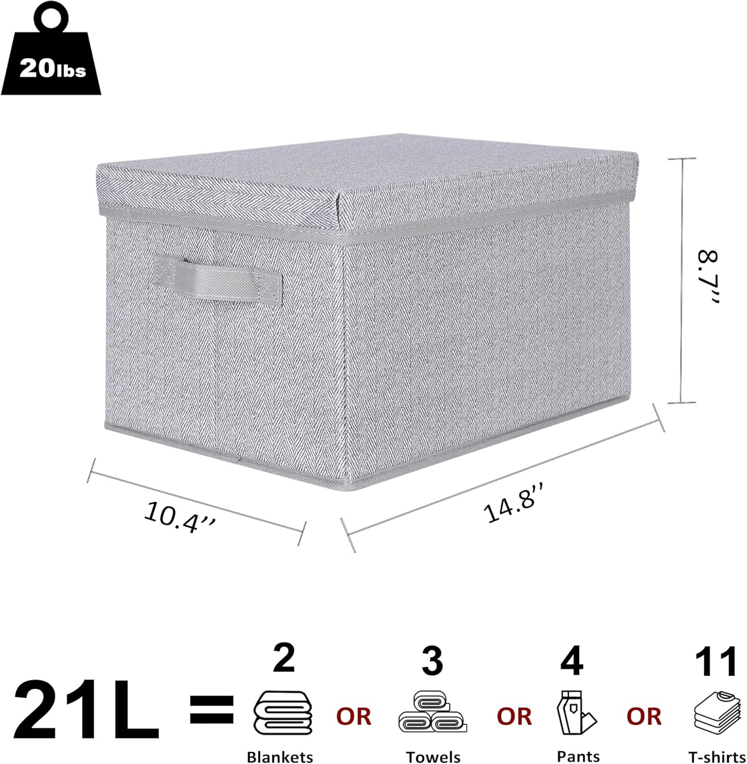 - Large Size & Versatile Storage: Each storage box with lid measures 14.8"L x 10.4"W x 8.7"H, with a capacity of 21 liters and weighs 1.53 lbs. Suitable for storing clothes, pants, socks, bed sheets, towels, blankets, books, and more. Fits in most closets, shelves, or under the bed.