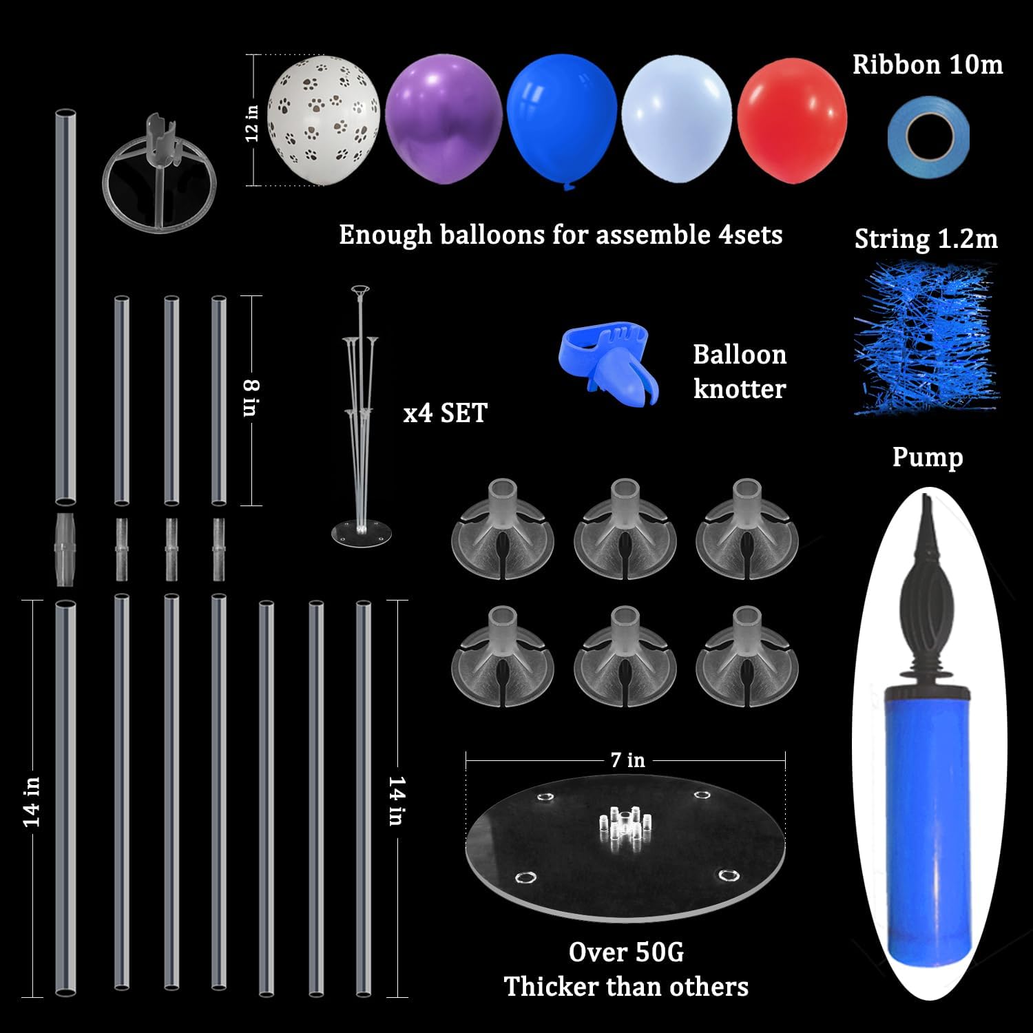 - WHAT INLCUDE: This balloon stand kit include 4 set balloon holders, 35 pcs balloons - blue red purple puppy paw balloons, balloon pump, balloon clips, ribbons, glue dots and tie tool