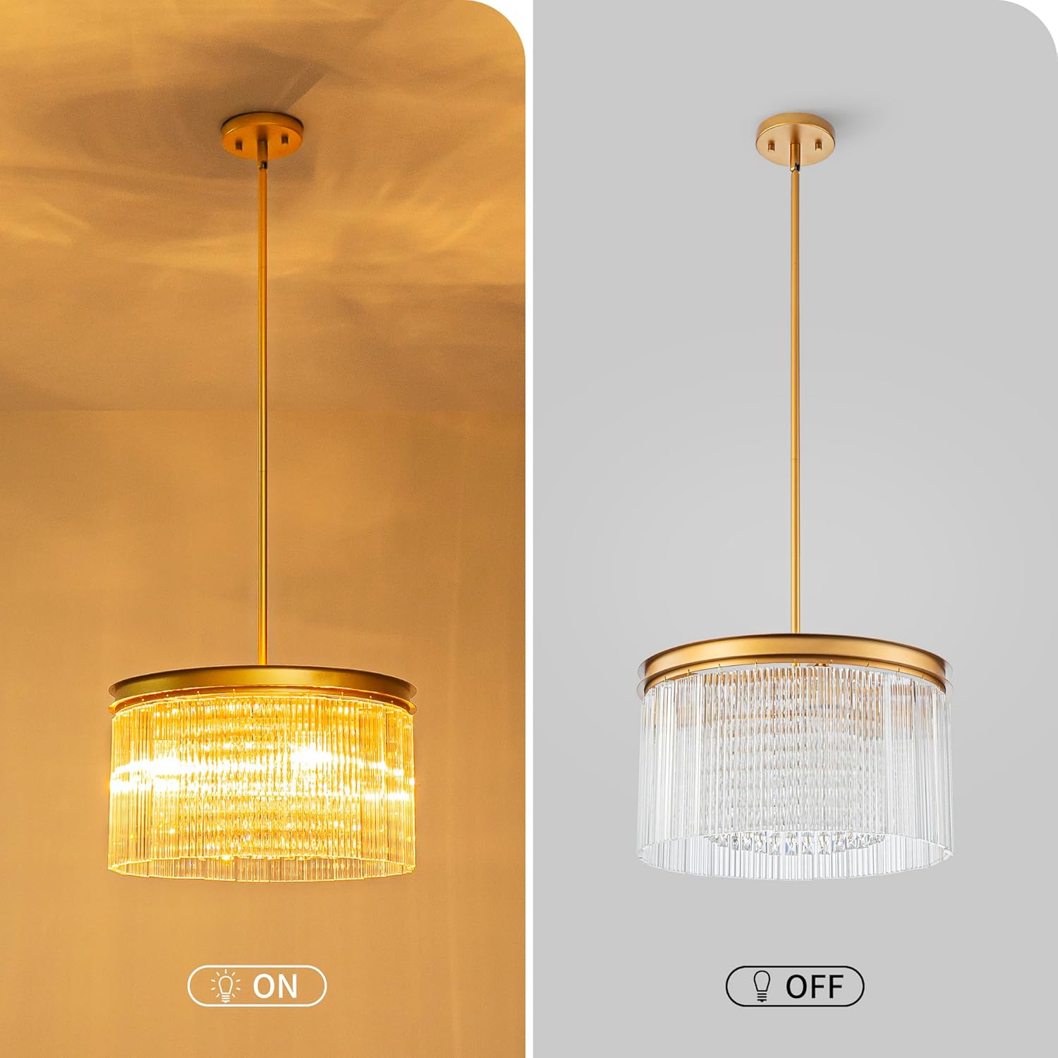 4-Lights Drum Glass Chandelier, Modern Style Light Fixture for Dining Room, Bedroom, Ripple Glass Shade & Brass Finish, D16.5 * H18~48 inch (Adjustable Height)