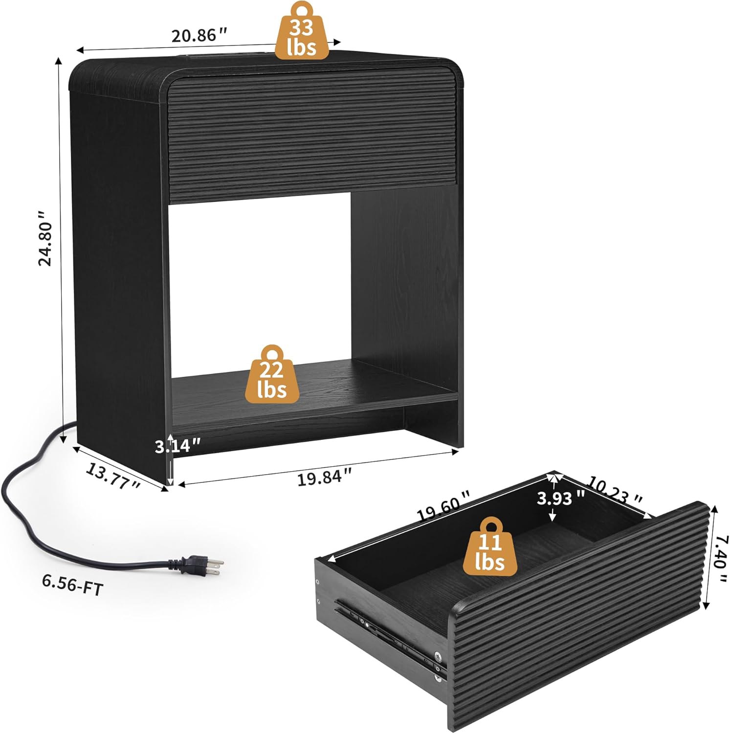 - ćMinimalist & Practicalć Our bed side table boasts a minimalist curve profile and a drawer with a unique waveform panel, perfectly balancing modern aesthetics with functional design. The chic appearance complements various bedroom styles, from contemporary to mid-century modern. The smooth lines and rounded corners make it safe for kids and families, creating a standout piece that elevates the ambiance of your room.