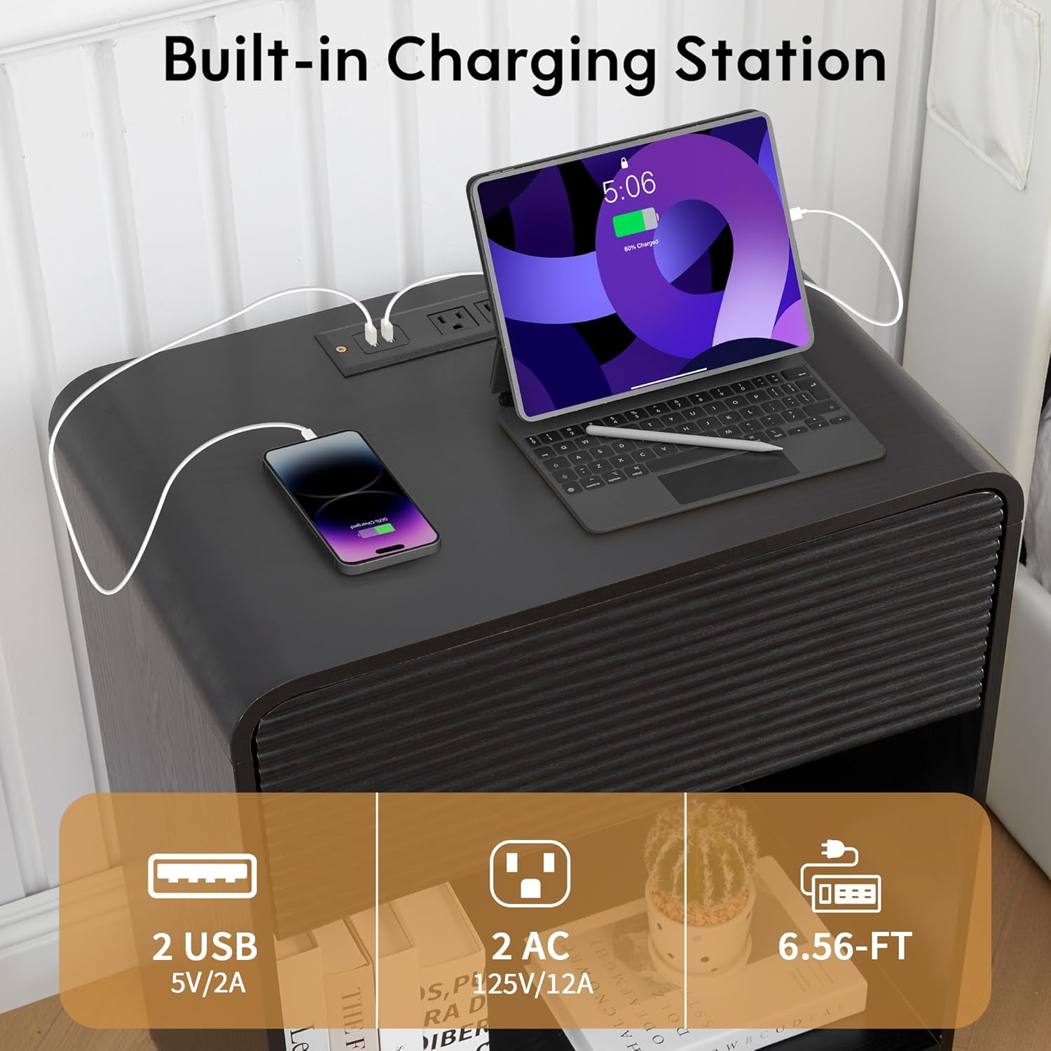 - ćVersatile Nightstand with Charging StationćBedside Cabinet with 2 AC outlets & 2 USB ports conveniently located along the top, this nightstand has your charging needs covered. Measuring 20.86"W Ć 13.77"D Ć 24.8"H, our large nightstand provides ample storage space for all your bedside essentials. From books and reading glasses to electronic devices and personal items, everything can find its place within this spacious night stand. With its roomy desktop, large drawer, and open compartment, our bedside table allows you to keep your belongings tidy and within reach.