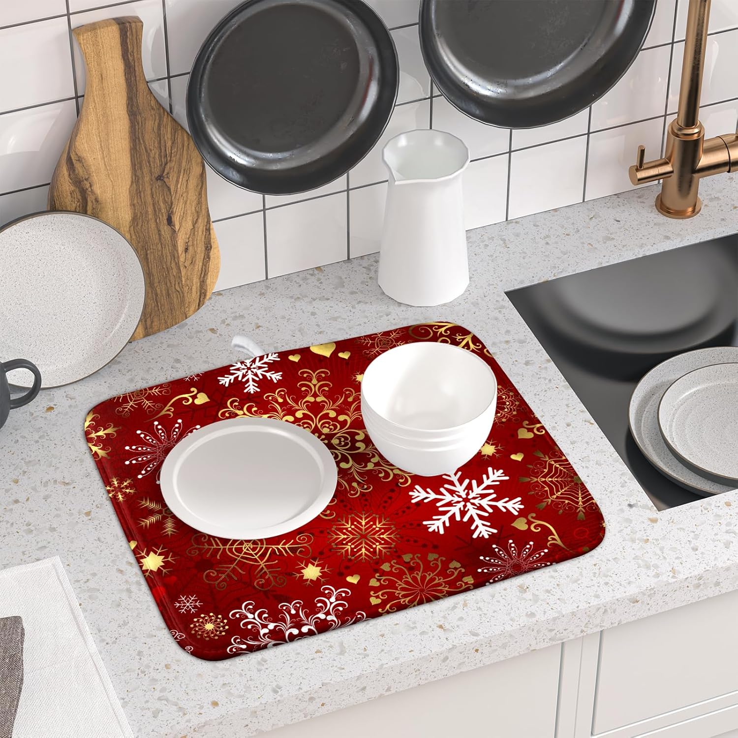 Red Snowflake Dish Drying Mat for Kitchen Counter Holiday Super Absorbent Reversible Microfiber Kitchen Countertop Protector Dishes Pad Small 16x18 inch