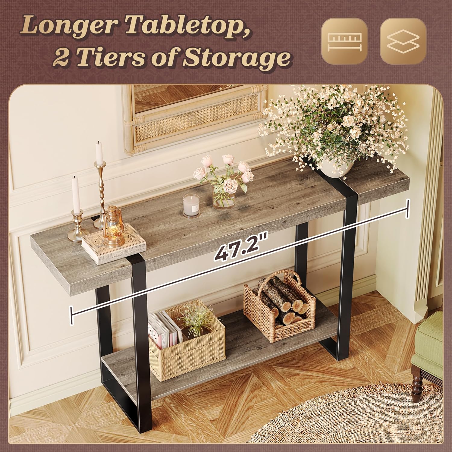 Huuger 47.2 Inch Entryway Table, 2-Tier Industrial Console Sofa Table with Storage, Accent Table, for Entry, Hallway, Entrance, Foyer, T-Shaped Metal Frame, Grey