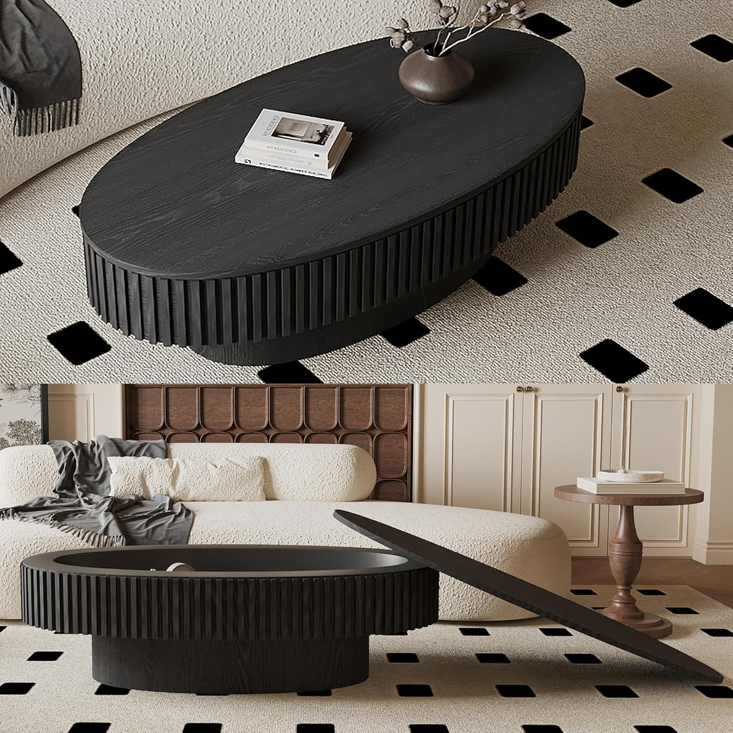 47.2''Oval Coffee Table with Storage, Mid Century Modern Fluted Drum Center Tables with Lid, Solid Wood Side Pedestal Coffee Table Tea Table for Living Room, Bedroom, Apartment-Black