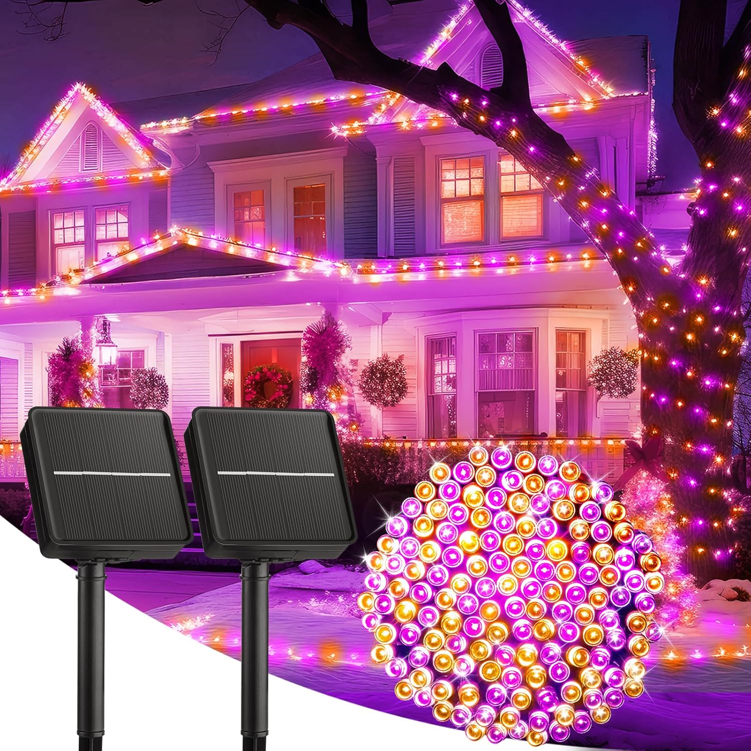 Brightown 2 Pack Halloween Solar String Lights Outdoor, Total 144Ft 400 LED Solar Lights Outdoor Waterproof with 8 Modes for Patio Tree Garden Party Decorations (Orange&Purple)