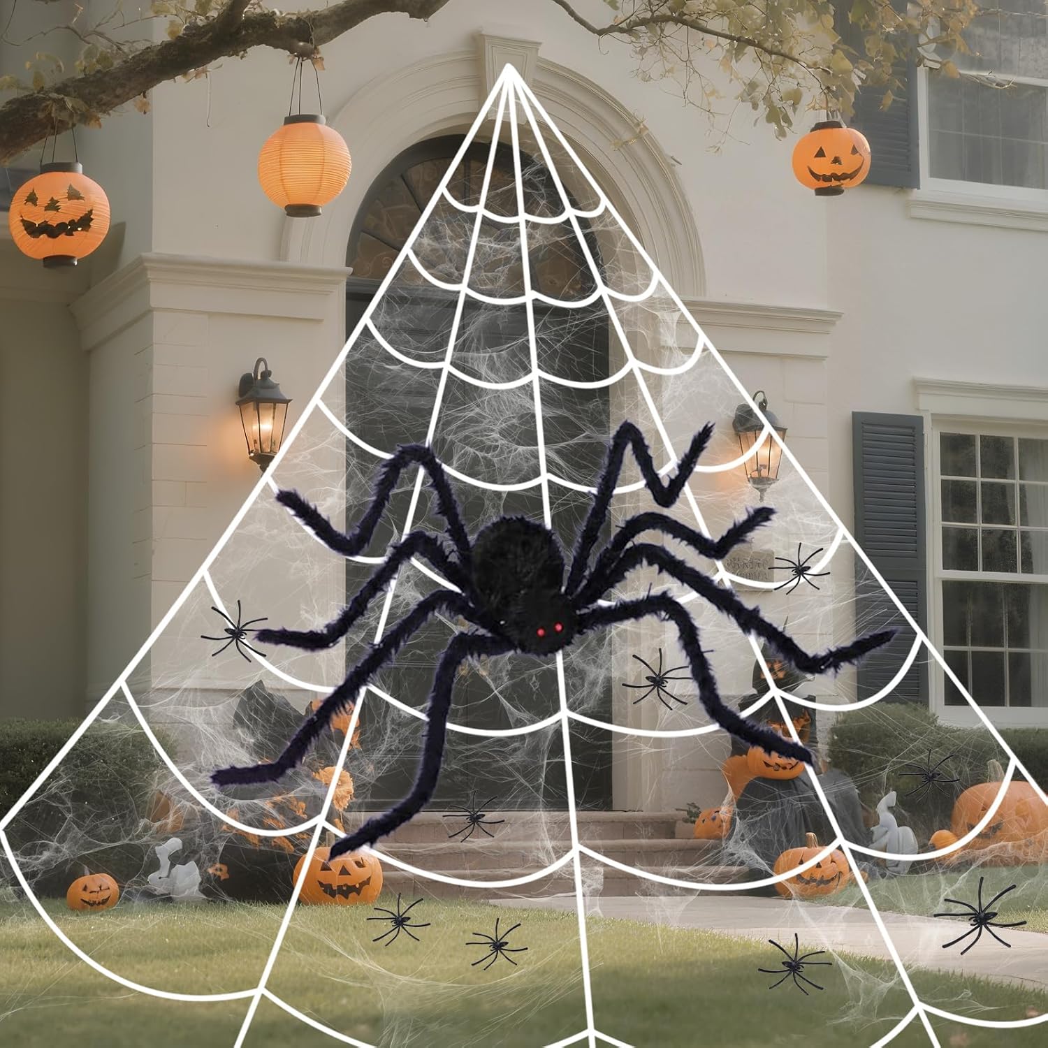 - 【Easy to install】The top hook of the giant spider web can be hung on the eaves, branches, or any other place where it can be hung. Then use ground stakes to secure the five threads at the end of the large spider web.Finally, by placing stretch webs and spiders, you can easily obtain frightening Halloween yard decorations.