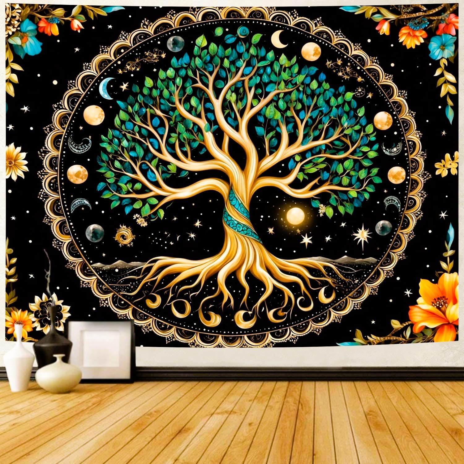 Delur Tree of Life Tapestry Moon Phase Nature Flower Plant Tapestry Wall Hanging Boho Mandala Spiritual Sun Aesthetic Psychedelic Headboard for Bedroom Living Room Home Decor (59.1" x 78.7")