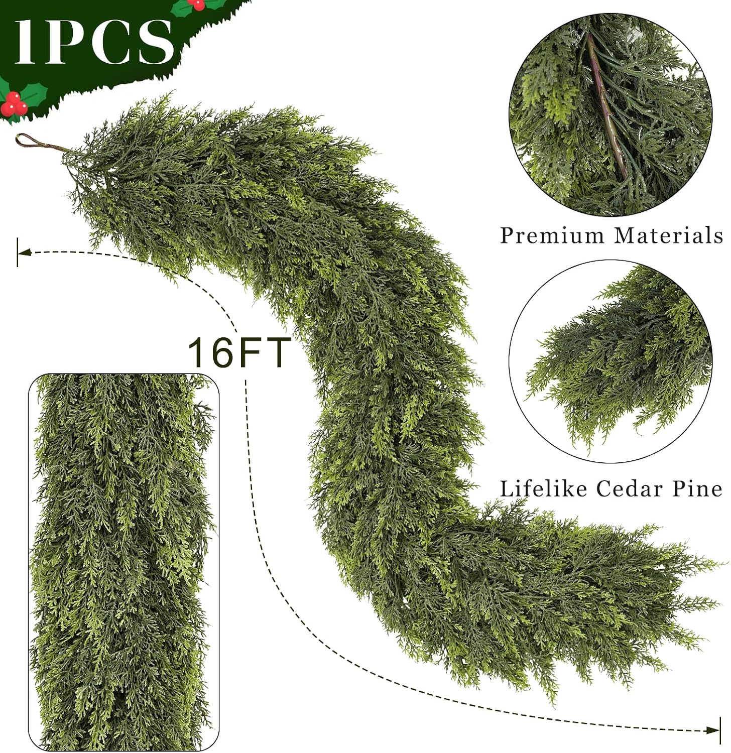 16FT Real Touch Cedar Garland for Fireplace - Artificial Christmas Garlands Realistic Faux Greenery Fake Pine Needles Garland for Holiday,Table, Window,Mantel,Stairs, Home,Indoor Outdoor Decor (1PCS)