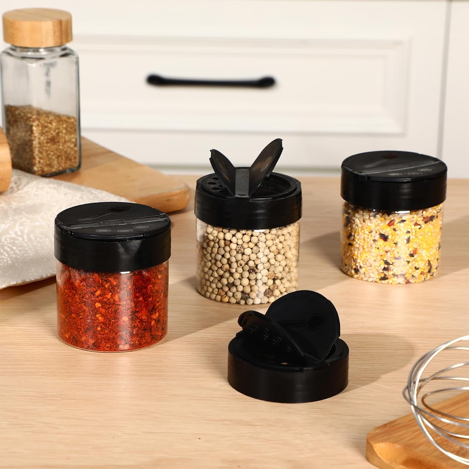 - Multi-Purpose: these plastic spice jars with shaker lids are perfect for storing dried spices, salt, peppers, seasonings, herb blends, powder, glitter, bath salts, crafts, etc.widely applied in kitchens, canteens, hotels, restaurants, cake shops and other places